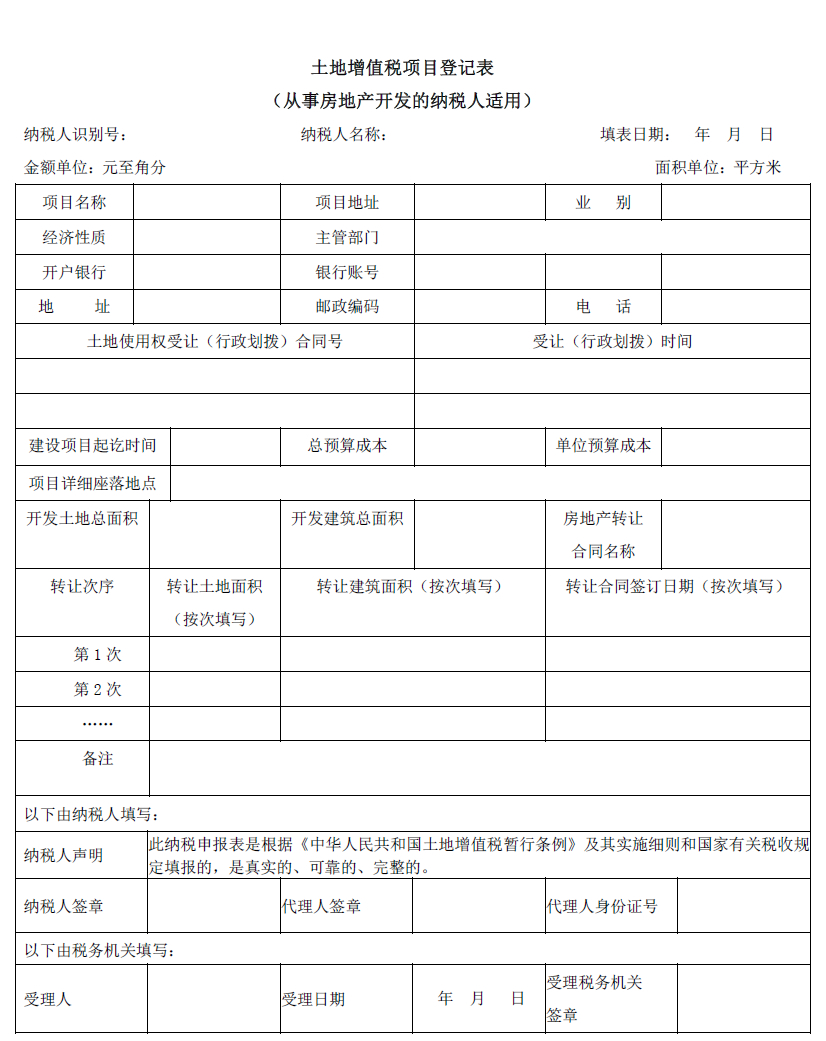 1.本表适用于从事房地产开发与建设的纳税人,在立项后及每次转让时填报。