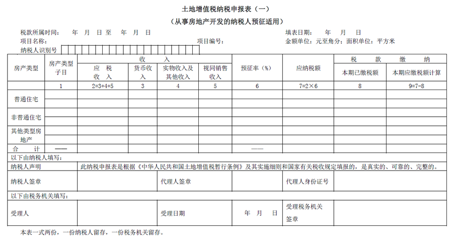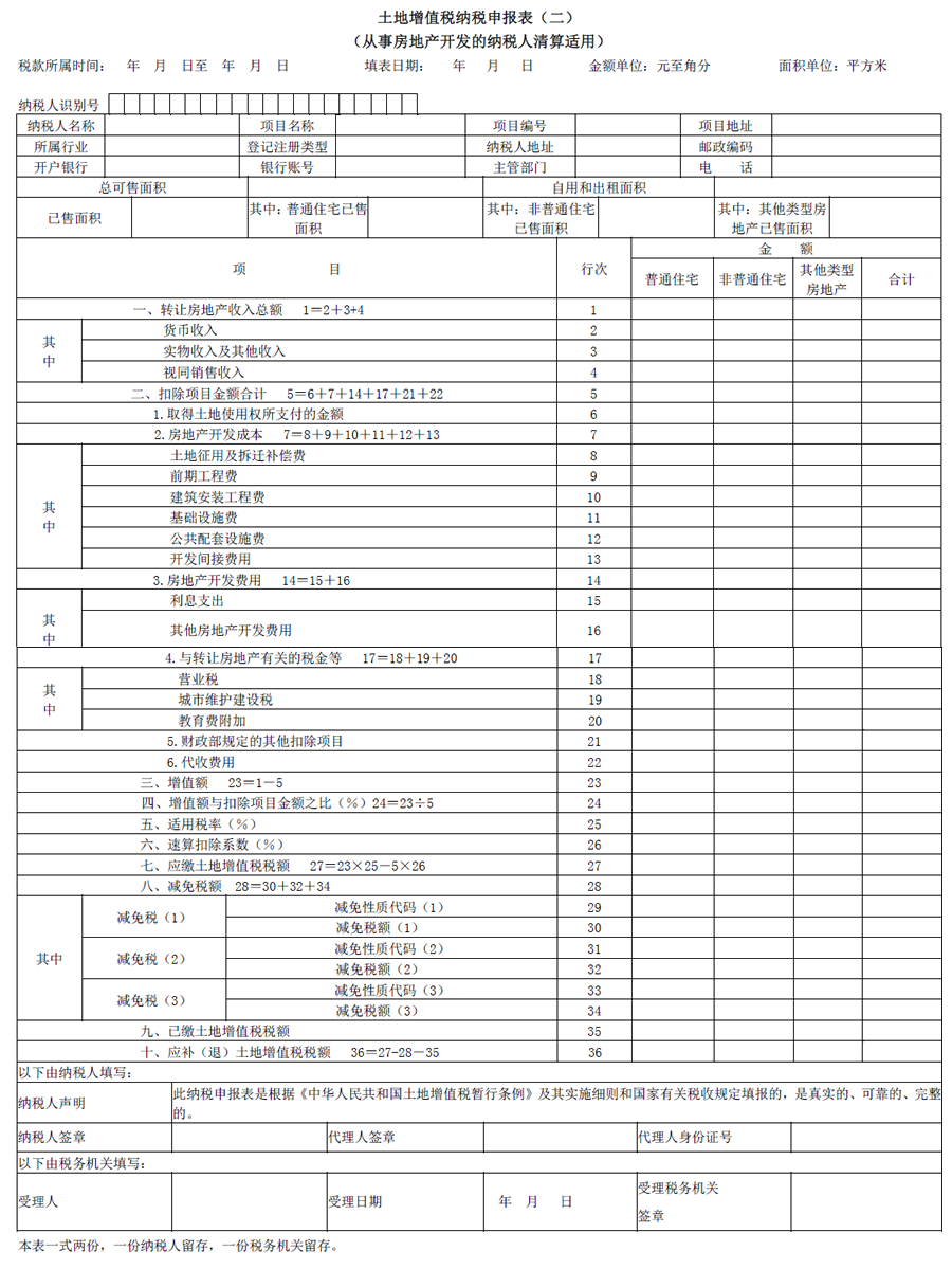 土地增值税纳税申报表(二),适用从事房地产开发并转让的土地增值税纳税人。