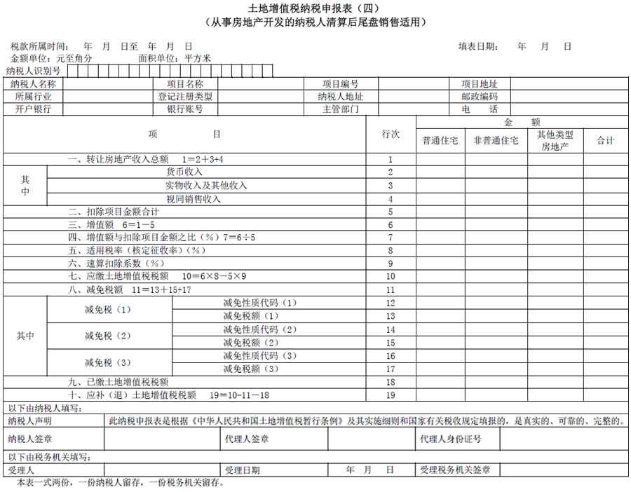 土地增值税纳税申报表(四),适用于从事房地产开发与建设的纳税人,在清算后尾盘销售时填报,各行次应按不同房产类型分别填写。