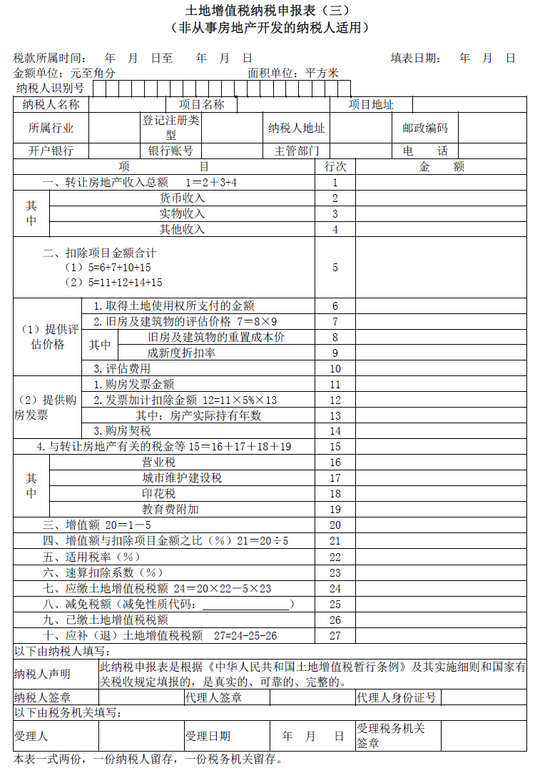土地增值税纳税申报表(三)适用于非从事房地产开发的纳税人。该纳税人应在签订房地产转让合同后的七日内,向房地产所在地主管税务机关填报土地增值税纳税申报表(三)。