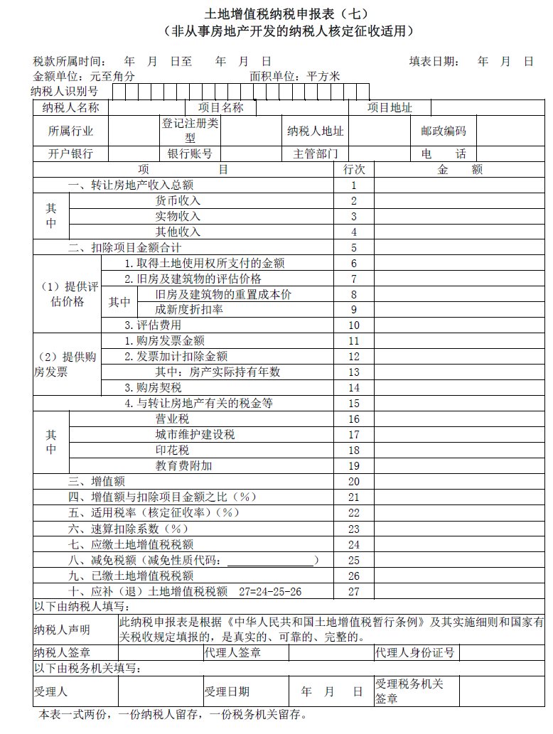 土地增值税纳税申报表(七)适用于非从事房地产开发的纳税人,清算方式为核定征收时填报。该纳税人应在签订房地产转让合同后的七日内,向房地产所在地主管税务机关填报土地增值税纳税申报表(七)。
