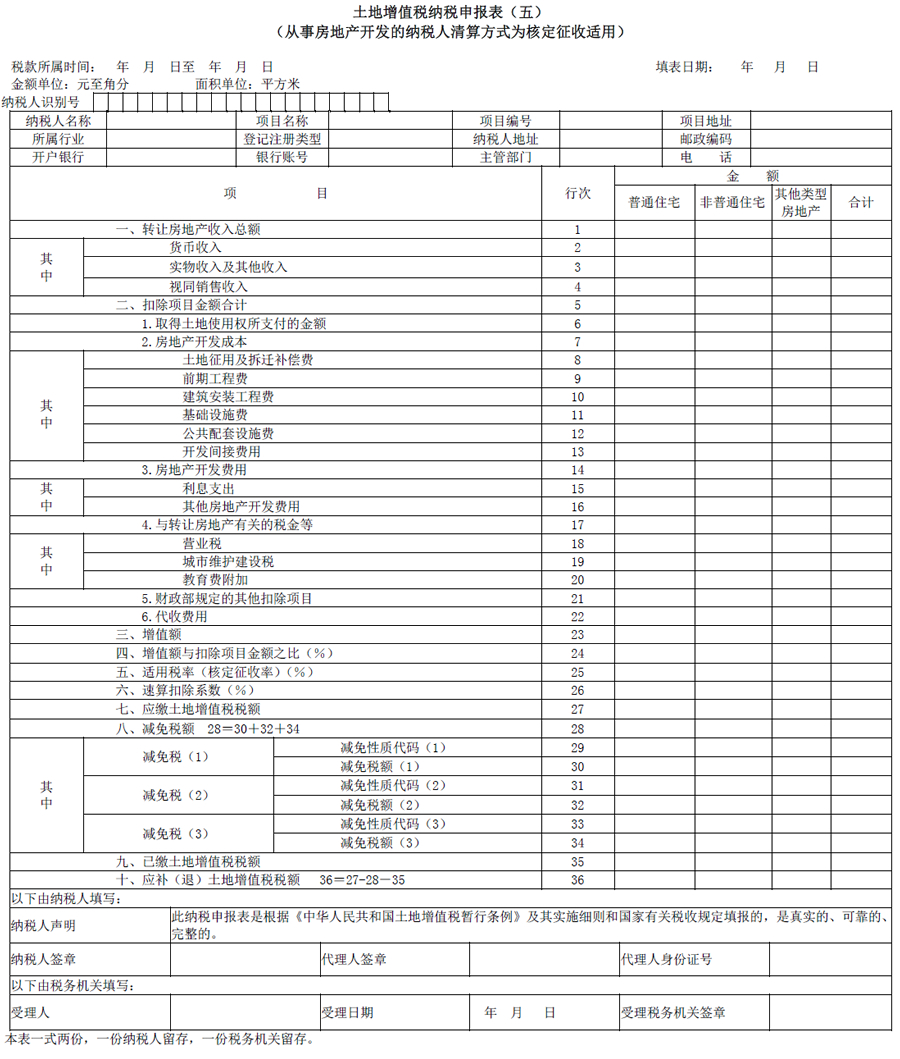 土地增值税纳税申报表(五),适用于从事房地产开发与建设的纳税人,清算方式为核定征收时填报,各行次应按不同房产类型分别填写。纳税人在填报土地增值税纳税申报表(五)时,应同时提交税务机关出具的核定文书。