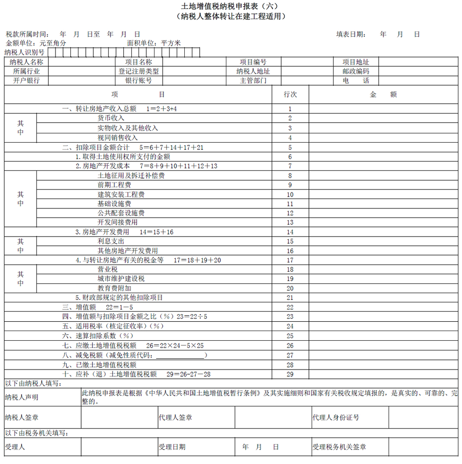 土地增值税纳税申报表(六),适用于从事房地产开发与建设的纳税人,及非从事房地产开发的纳税人,在整体转让在建工程时填报,数据应填列至其他类型房地产类型中。