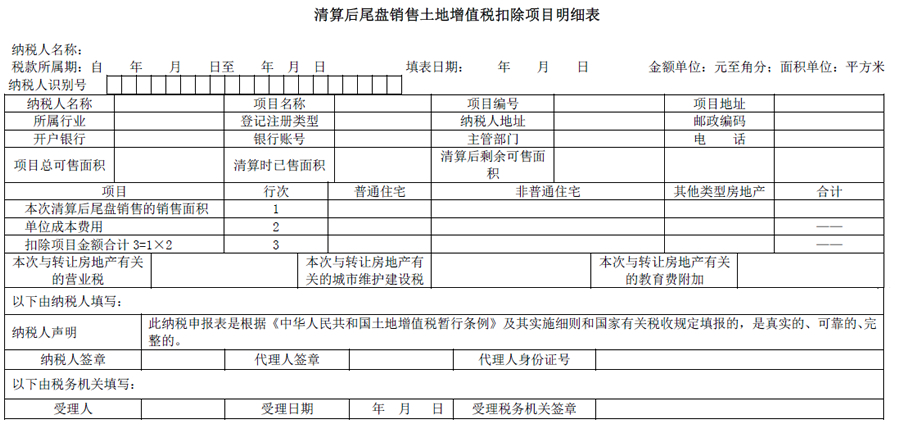 5.表第5栏各类型“扣除项目金额合计”应为附表“清算后尾盘销售土地增值税扣除项目明细表”中对应的该类型扣除项目金额合计数额。