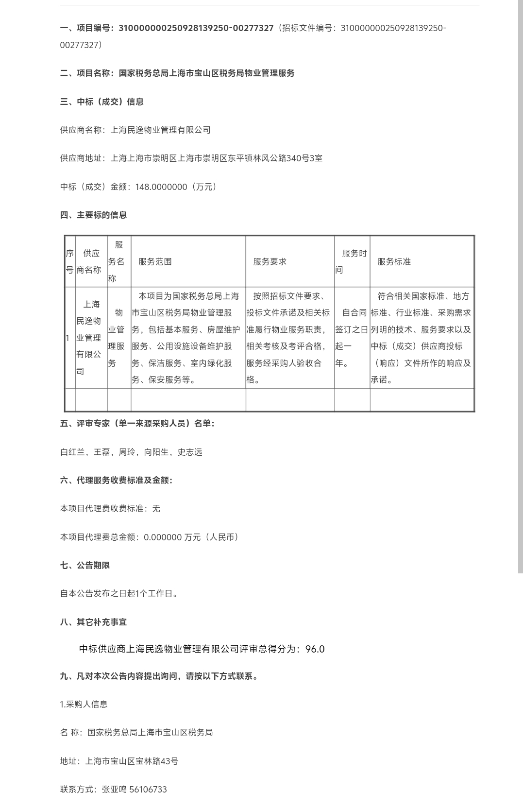 名称: 国家税务总局上海市宝山区税务局物业管理服务中标公告