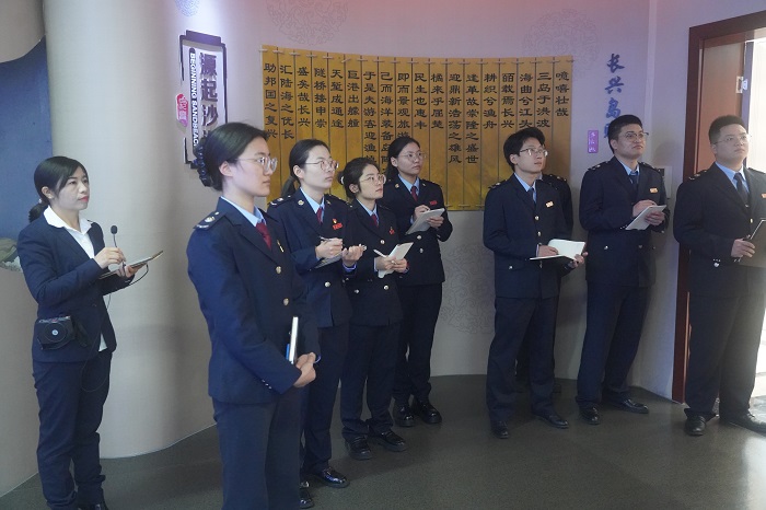 税务干部先后走进党群服务中心的历史展厅和规划展厅,从起源历程、长兴记忆、农垦文化到数字长兴、三岛建设和《长兴长兴》宣传片,回望征途千山远,翘首前路万木春。前卫人奋斗不息的崇高精神与四大央企海洋强国的伟大使命,加深了新进公务员对长兴岛的全面了解,更坚定了对长兴新时代未来发展的强大信心。