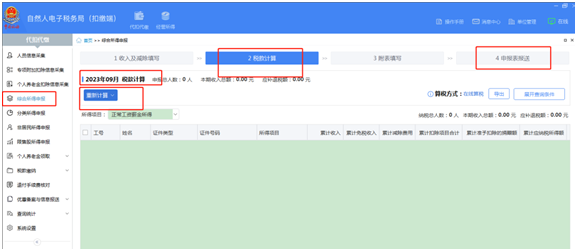 二、自然人电子税务局(扣缴端)中申报个税时,提示“上一属期未按照6万扣除减除费用”如何处理? ① 登录自然人电子税务局(扣缴端)-点击【首页】,将税款所属期改为当年1月份。 ② 依次点击【综合所得申报】-【正常工资薪金所得】-【收入和减除费用填写】页面-选择该员工,点击右上角【更多操作】-【减除费用扣除确认】-把【是】改为【否】,点击确认。 ③操作完成后,将首页的税款所属期改为当前申报月份,重新计算税款,发送申报即可。