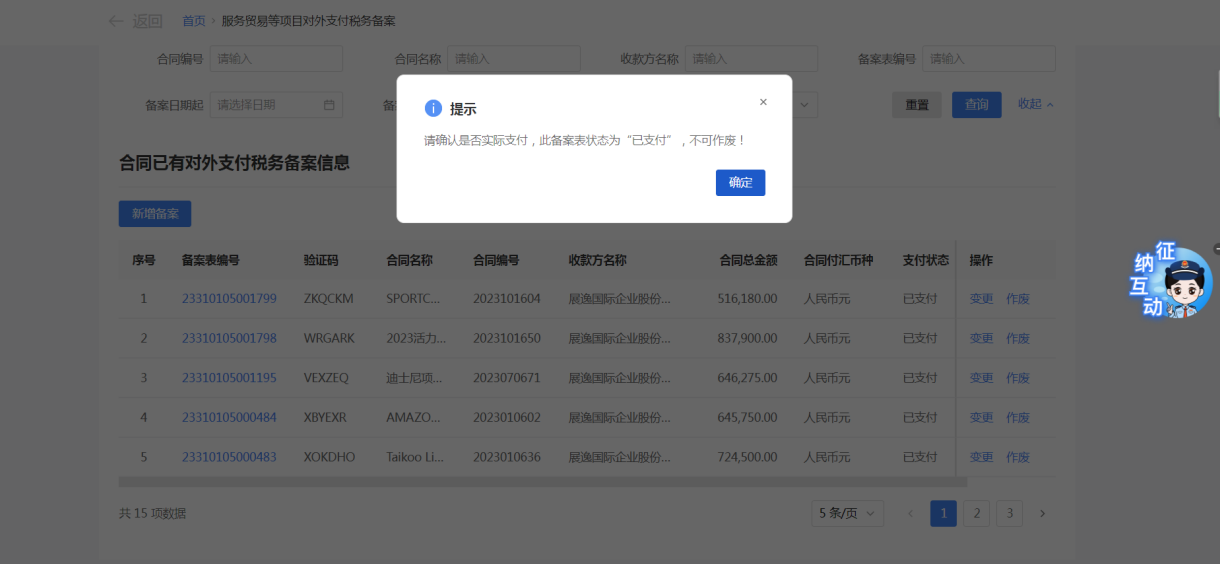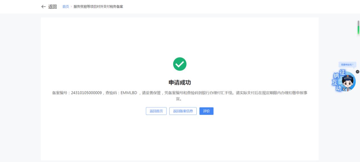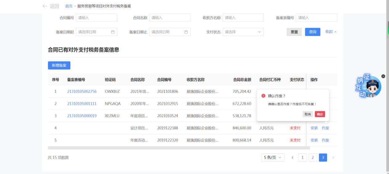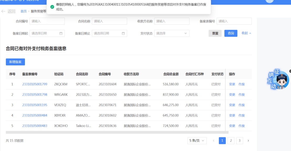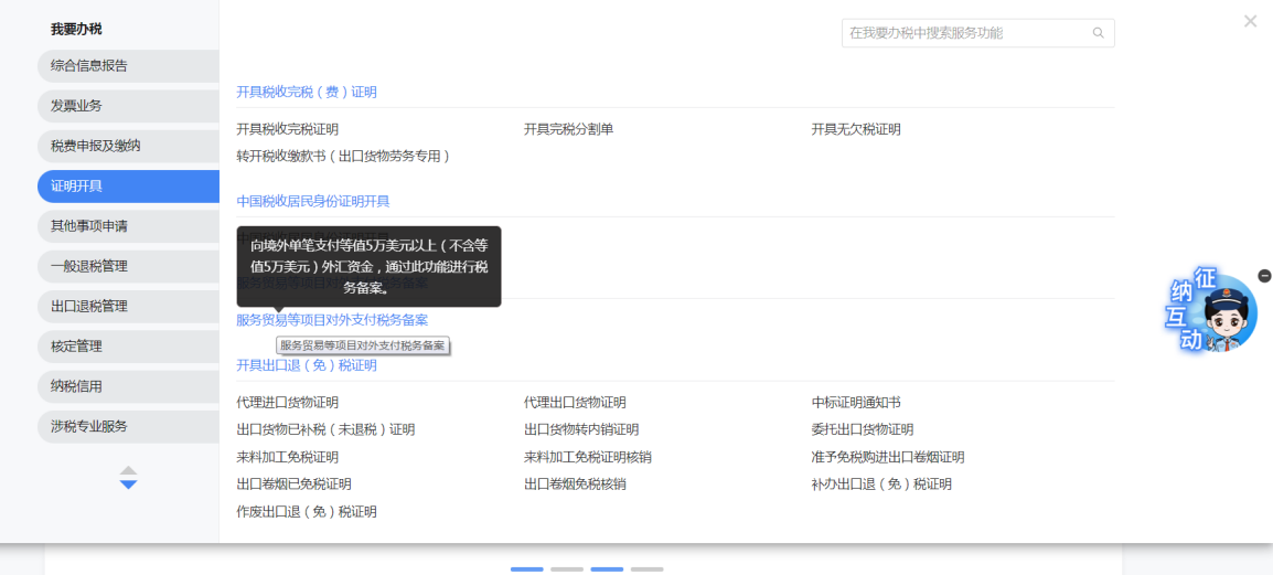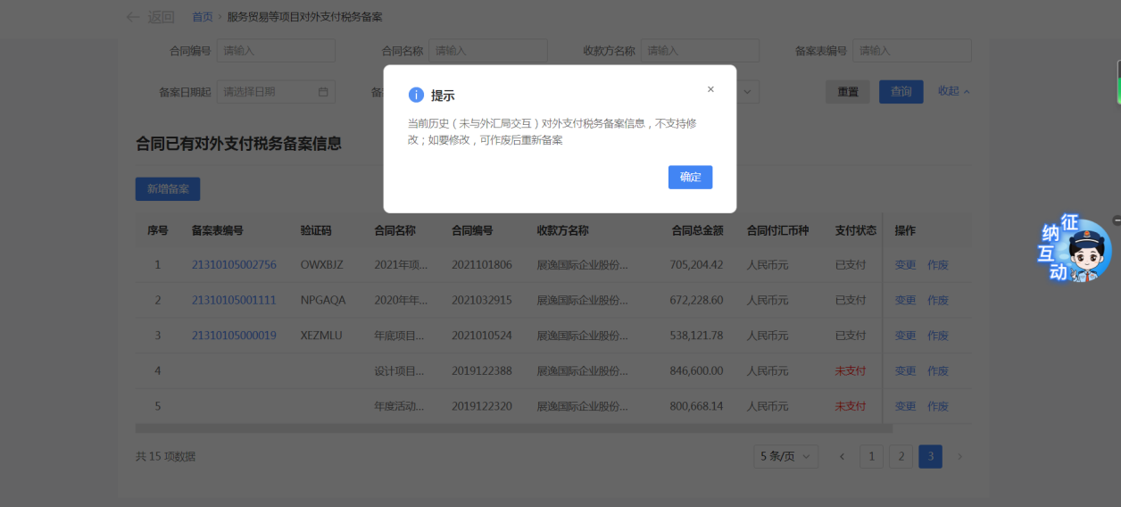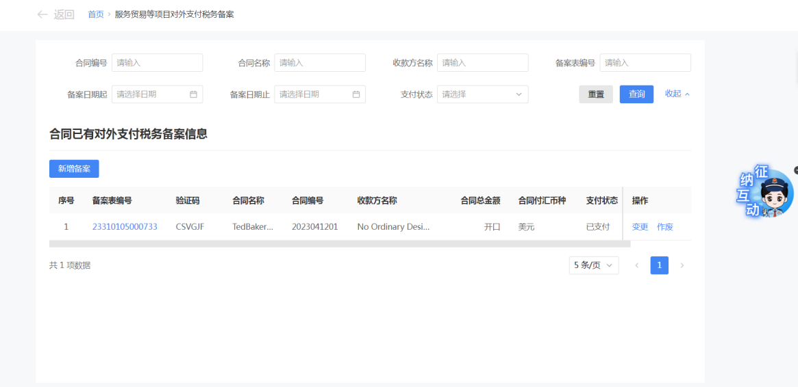 一、业务前提 境内机构和个人(以下称备案人)向境外单笔支付等值5万美元以上(不含等值5万美元,下同)下列外汇资金,除《国家税务总局 国家外汇管理局关于服务贸易等项目对外支付税务备案有关问题的公告》(国家税务总局公告2013年第40号发布,国家税务总局公告2018年第31号修改)第三条规定的情形和《国家税务总局 国家外汇管理局关于服务贸易等项目对外支付税务备案有关问题的补充公告》(国家税务总局 国家外汇管理局公告2021年第19号)第二条规定的情形外,均应向所在地主管税务机关进行税务备案。 二、功能路径 【我要办税】-【证明开具】-【服务贸易等项目对外支付税务备案】 三、税务备案流程 (一) 登录新电子税局后,点击【我要办税】-【证明开具】-【服务贸易等项目对外支付税务备案】功能菜单。 (二) 新增备案 (1)进入功能后,点击“新增备案”按钮; (2)选择需要进行对外支付税务备案的合同;无合同的情况下可以点击“新增合同”按钮,进行合同新增; (3)选择合同后,点击“确定”进入备案信息填写,信息填写完整后,点击“下一步”; (4)上传附送资料后,点击“下一步”; (5)进入表单预览,点击“提交”; (6)提交成功。 (三)查询备案信息 根据纳税人查询条件,可点击“查询”已备案信息。 (四)更正备案信息 (1)选择需要更正的已备案记录,点击“变更”,填报操作参考新增备案; (2)更正成功。 (3)对于已备案但无备案表编号的历史备案数据,不允许修改,只能作废。点击修改备案时弹出提示“当前历史(未与外汇局交互)对外支付税务备案信息,不支持修改;如要修改,可作废后重新备案”。 (五)作废备案信息。 (1)选择需要作废的已备案记录,点击“作废”; (2)作废成功。 (3)当已备案记录的支付状态为“已支付”时,不允许作废。点击作废备案信息时弹出提示“请确认是否实际支付,此备案表状态为‘已支付’,不可作废”。