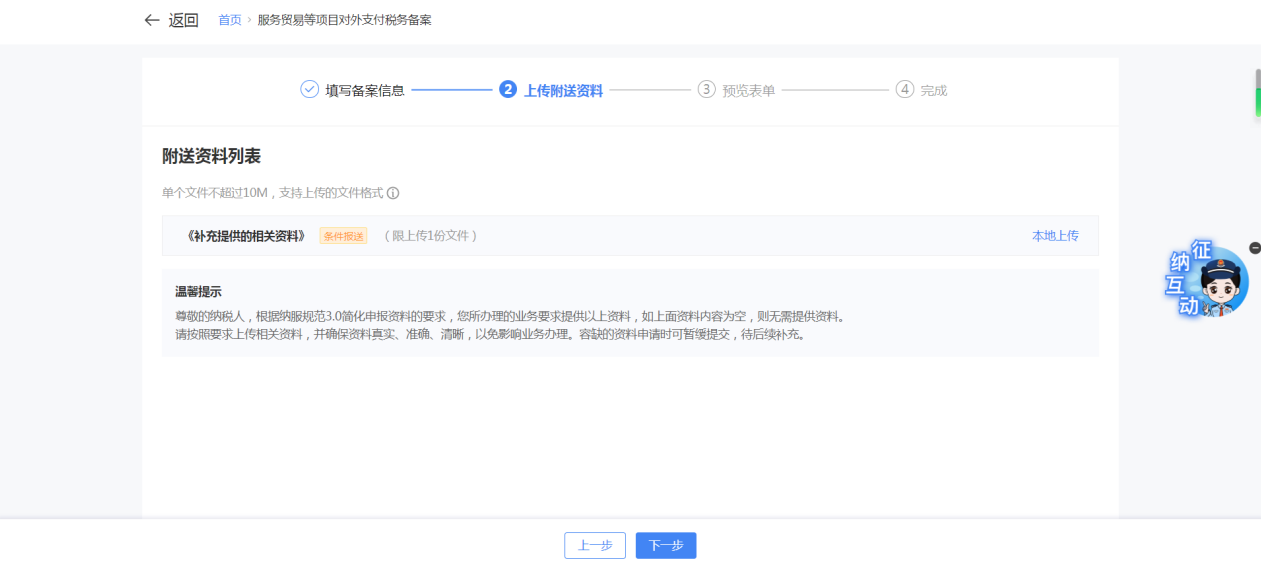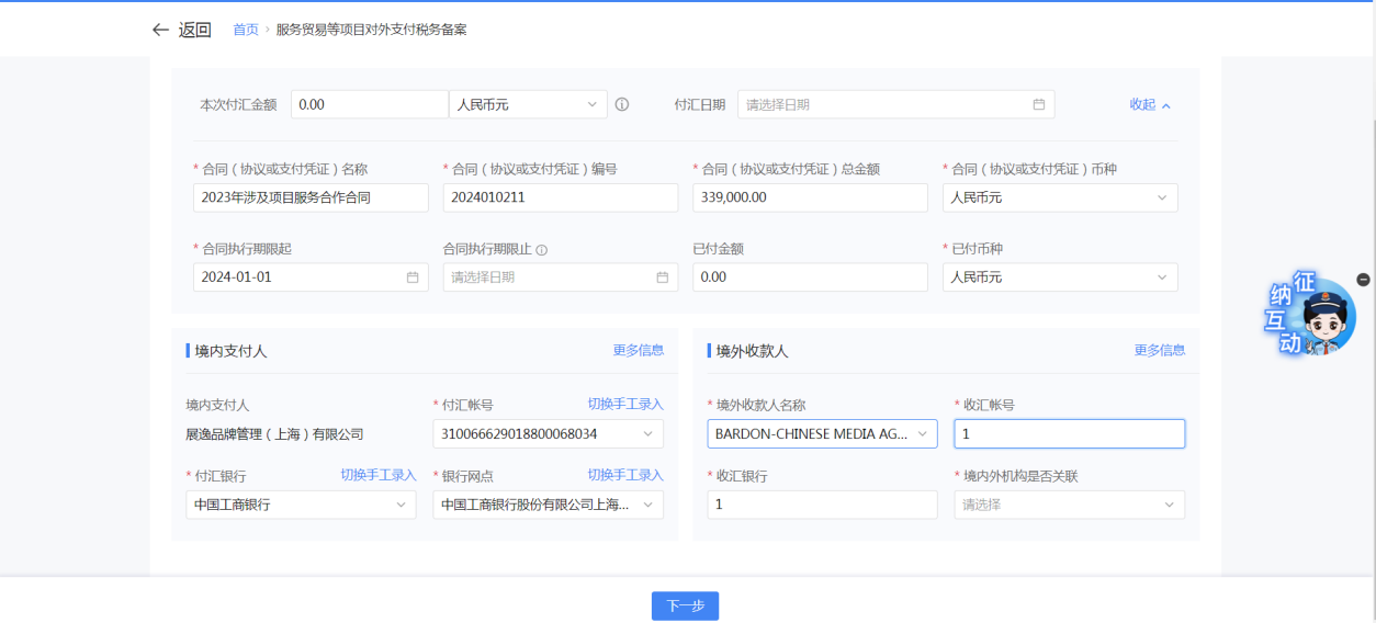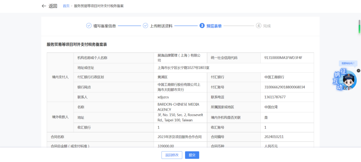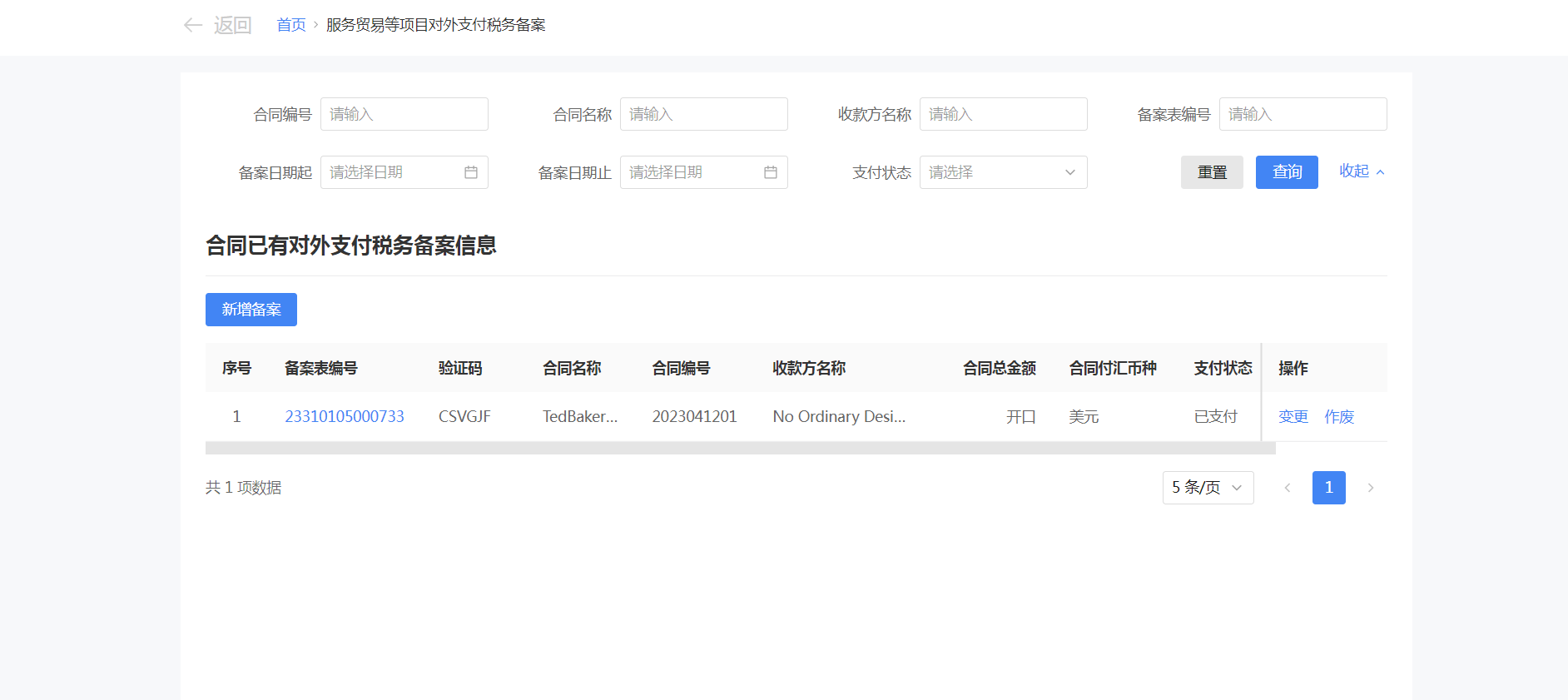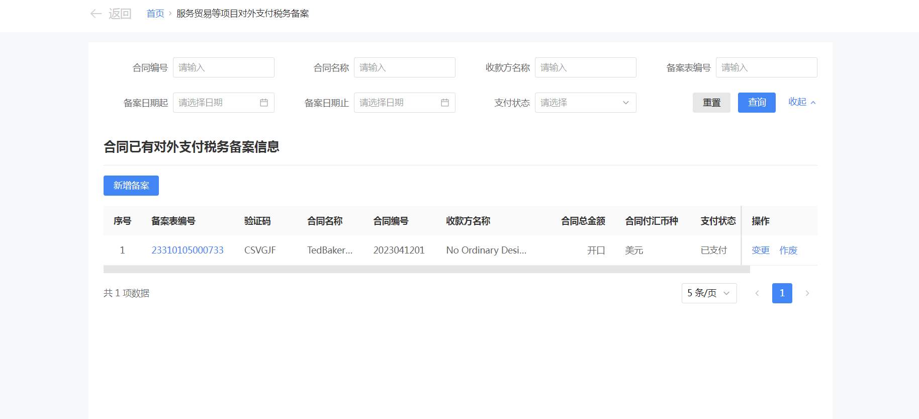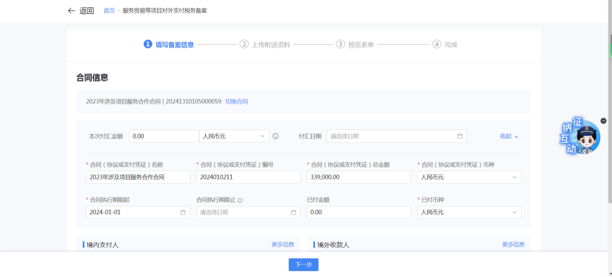 一、业务前提 境内机构和个人(以下称备案人)向境外单笔支付等值5万美元以上(不含等值5万美元,下同)下列外汇资金,除《国家税务总局 国家外汇管理局关于服务贸易等项目对外支付税务备案有关问题的公告》(国家税务总局公告2013年第40号发布,国家税务总局公告2018年第31号修改)第三条规定的情形和《国家税务总局 国家外汇管理局关于服务贸易等项目对外支付税务备案有关问题的补充公告》(国家税务总局 国家外汇管理局公告2021年第19号)第二条规定的情形外,均应向所在地主管税务机关进行税务备案。 二、功能路径 【我要办税】-【证明开具】-【服务贸易等项目对外支付税务备案】 三、税务备案流程 (一) 登录新电子税局后,点击【我要办税】-【证明开具】-【服务贸易等项目对外支付税务备案】功能菜单。 (二) 新增备案 (1)进入功能后,点击“新增备案”按钮; (2)选择需要进行对外支付税务备案的合同;无合同的情况下可以点击“新增合同”按钮,进行合同新增; (3)选择合同后,点击“确定”进入备案信息填写,信息填写完整后,点击“下一步”; (4)上传附送资料后,点击“下一步”; (5)进入表单预览,点击“提交”; (6)提交成功。 (三)查询备案信息 根据纳税人查询条件,可点击“查询”已备案信息。 (四)更正备案信息 (1)选择需要更正的已备案记录,点击“变更”,填报操作参考新增备案; (2)更正成功。 (3)对于已备案但无备案表编号的历史备案数据,不允许修改,只能作废。点击修改备案时弹出提示“当前历史(未与外汇局交互)对外支付税务备案信息,不支持修改;如要修改,可作废后重新备案”。 (五)作废备案信息。 (1)选择需要作废的已备案记录,点击“作废”; (2)作废成功。 (3)当已备案记录的支付状态为“已支付”时,不允许作废。点击作废备案信息时弹出提示“请确认是否实际支付,此备案表状态为‘已支付’,不可作废”。