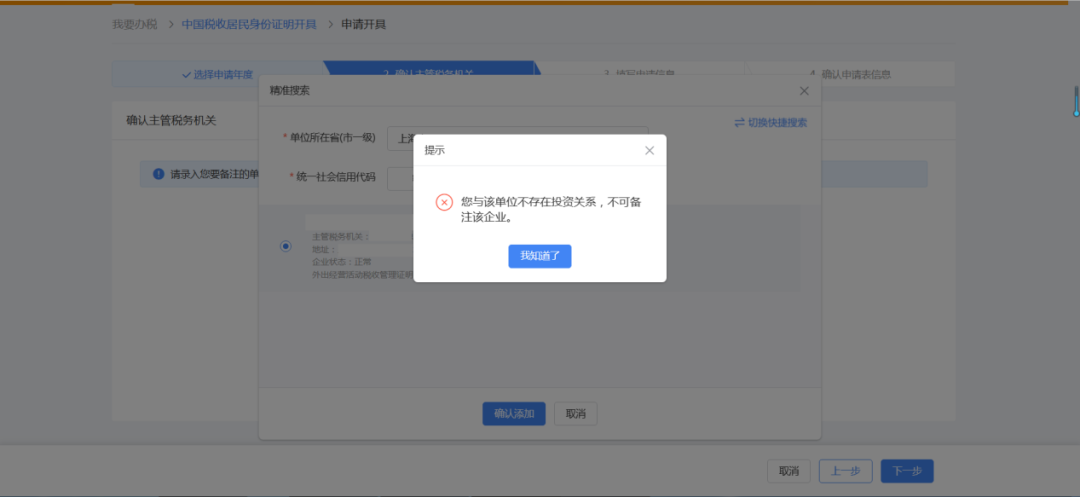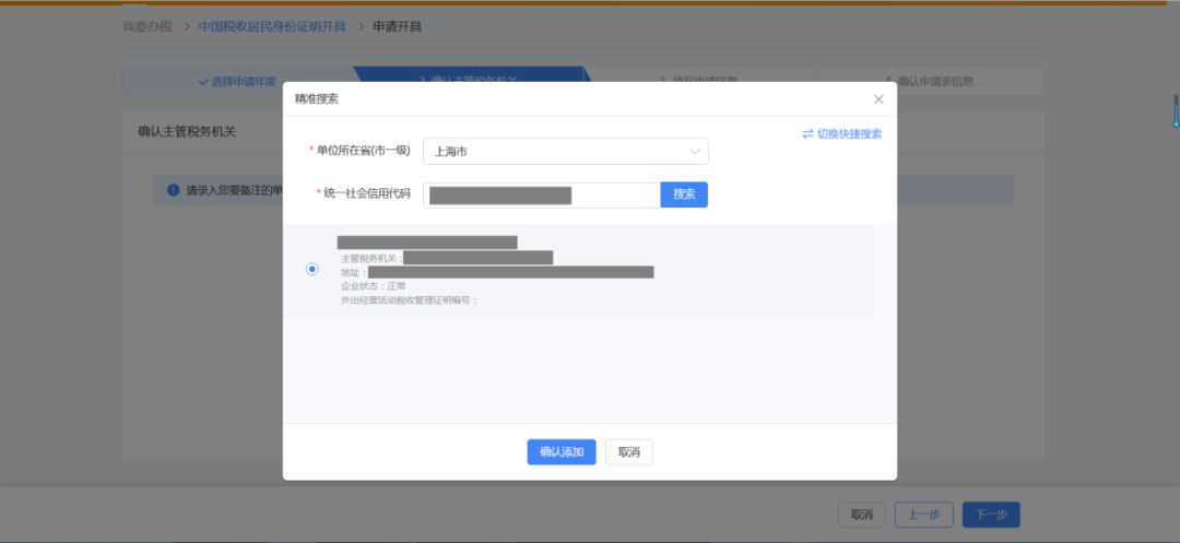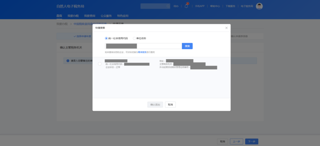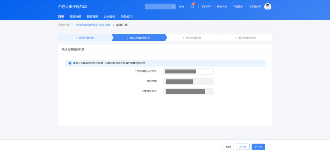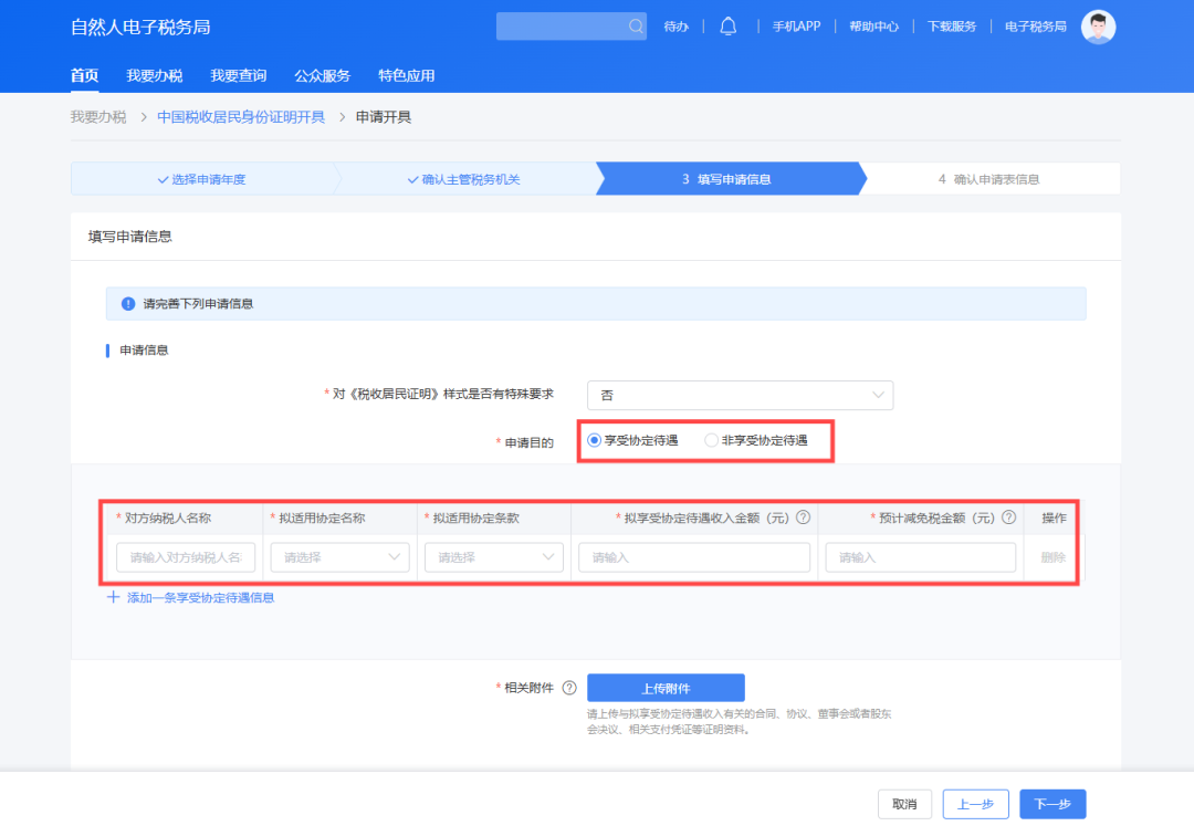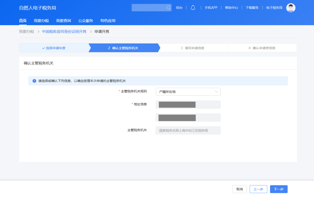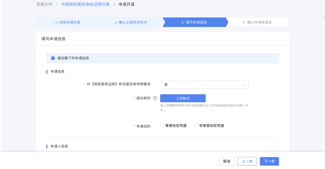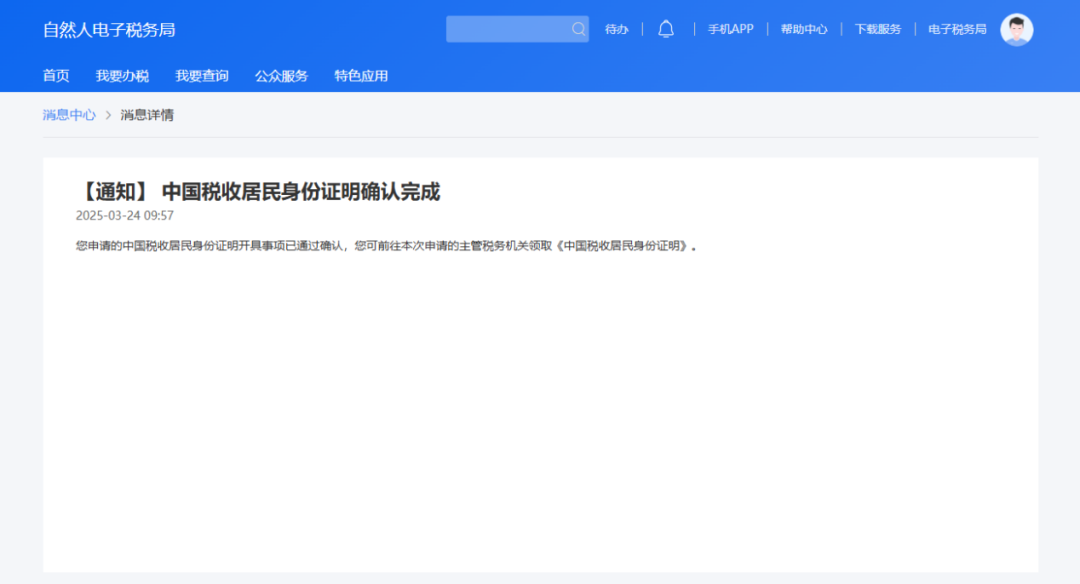 居民个人新版中国税收居民身份证明线上办理流程如下: 第二步,系统将提示办理须知,勾选【我已阅读并知晓】,进入填报。 第三步,选择申请年度。需填写申请年度、对方国家(地区)及是否在《税收居民证明》上备注信息。申请人可以就其构成中国税收居民的任一公历年度开具《税收居民证明》。 若申请人为中国境内注册登记的个体工商户、个人独资企业或合伙企业,并且需要在《税收居民证明》上备注信息,请按自身登记注册类型勾选对应选项并上传登记注册证书;若不属于上述情形,请勾选【无需备注信息】。 第四步,确认主管税务机关。若申请人在“是否在《中国税收居民身份证明》上备注信息”勾选【无需备注信息】,主管税务机关规则可选择【户籍所在地】或【经常居住地】。 若申请人在“是否在《中国税收居民身份证明》上备注信息”勾选相关选项,需录入要备注的单位信息,以确定受理本次申请的主管税务机关。点击【单位纳税人识别号】,可在弹窗中输入统一社会信用代码或单位名称,点击【搜索】,查询单位信息。如“快捷搜索”未查询出您的企业,可点击切换为“精准搜索”进行查找。“单位所在省(市一级)”选择企业所在省/市,输入统一社会信用代码进行搜索。 以合伙企业为例,查询到单位信息后,勾选企业,点击确认添加,如申请人与被选企业存在投资关系,系统提示“《税收居民证明》的纳税人名称后拟备注:XX(居民个人名称)是XXXXX(企业名称)的合伙人”;反之,系统提示“您与该单位不存在投资关系,不可备注该企业。” 录入需备注的单位信息后,点击【下一步】。 第五步,填写申请信息。如果“对《税收居民证明》样式是否有特殊要求”选择【是】,需上传“需要特殊样式的书面说明以及《中国税收居民身份证明》样式”,“证明领取方式”只能选择【大厅领取】。 “申请目的”可选择【享受协定待遇】或【非享受协定待遇】。若您选择【享受协定待遇】,需填写对方纳税人名称和拟适用协定名称等信息,并上传“与拟享受协定待遇收入有关的合同、协议、董事会或者股东决议、相关支付凭证等证明材料”。 若您选择【非享受协定待遇】,需填写【非享受协定待遇的备注信息】,并上传“能证明申请目的真实性的有关材料,如政府监管部门等出具的需申请人提供《税收居民证明》的正式文书,或者有关法律依据、其他能证明申请目的真实性的材料”。(该备注供税务机关审核使用,不会展示在最终出具的证明文本上)。 核对申请人信息。若“在中国境内是否有住所”选择【是】,“有住所个人提供因户籍、家庭、经济利益关系而在中国境内习惯性居住的证明材料或说明材料”可勾选【户籍】、【家庭】、【经济利益】并需上传相关材料,上述选项可多选。 若“在中国境内是否有住所”选择【否】,“申请年度在中国境内累计居住天数是否满足《中华人民共和国个人所得税法》等有关规定”可勾选【是】或【否】;若选择【是】,需提供“有关部门出具的申请人申请年度出入境记录”、“申请人申请年度护照”(港澳居民需提供《港澳居民来往内地通行证》,台湾居民需提供《台湾居民来往大陆通行证》)。 若选择【否】,系统将提示“如在中国境内没有住所且申请年度在中国境内累计居住天数不满足《中华人民共和国个人所得税法》等有关规定,则不符合中国税收居民身份标准,请重新确认”。 如您有其他需要补充提供的材料,可在“其他材料”模块上传。“证明领取方式”可选择【电子领取】或【大厅领取】。选择【电子领取】的,在税务机关确认通过后,可在自然人电子税务局接收到《税收居民证明》电子版。 第六步,核对您填写的申请表信息,如您核对无误点击【提交】,系统将提示“申请提交成功!如果您取得了境外所得,请按照《中华人民共和国个人所得税法》及其实施条例等有关规定,就来源于中国境内、境外的所得及时进行汇算申报。” 第七步,您可以在【我要办税】-【中国税收居民身份证明开具】-【查询已申请的记录】中查询办理进度。 领取证明 (2)若您选择大厅领取 新版《税收居民证明》取消了主管税务机关负责人签字,改为加盖主管税务机关公章。 |