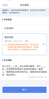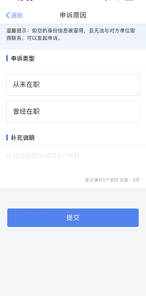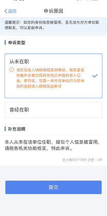 二、什么情况下可以发起申诉? 答:当您发现您的任职受雇信息、收入纳税明细信息、办税权限与实际不相符时,可以就不属实的信息发起申诉。 主要包括:被任职、被财务(办税权限)、被收入三类。 特别注意: 1. “从未在职”指从来没有在被申诉单位任职过;“曾经在职”指曾经在被申诉单位任职过,现在已离职。在发起申诉时一定要根据真实情况选择申诉原因,不可随意选择,否则将被视为申诉不实。 2. 填写补充说明(至少填写5个字符),如果申诉类型为【曾经在职】,需要补充说明离职时间。点击【提交】按钮,提交申诉。 3. 提交后系统弹出确认标签页,阅读确认内容,确定需要提交的,勾选“我已阅读并同意”,点击【确认提交】按钮,即完成该事项的申诉。