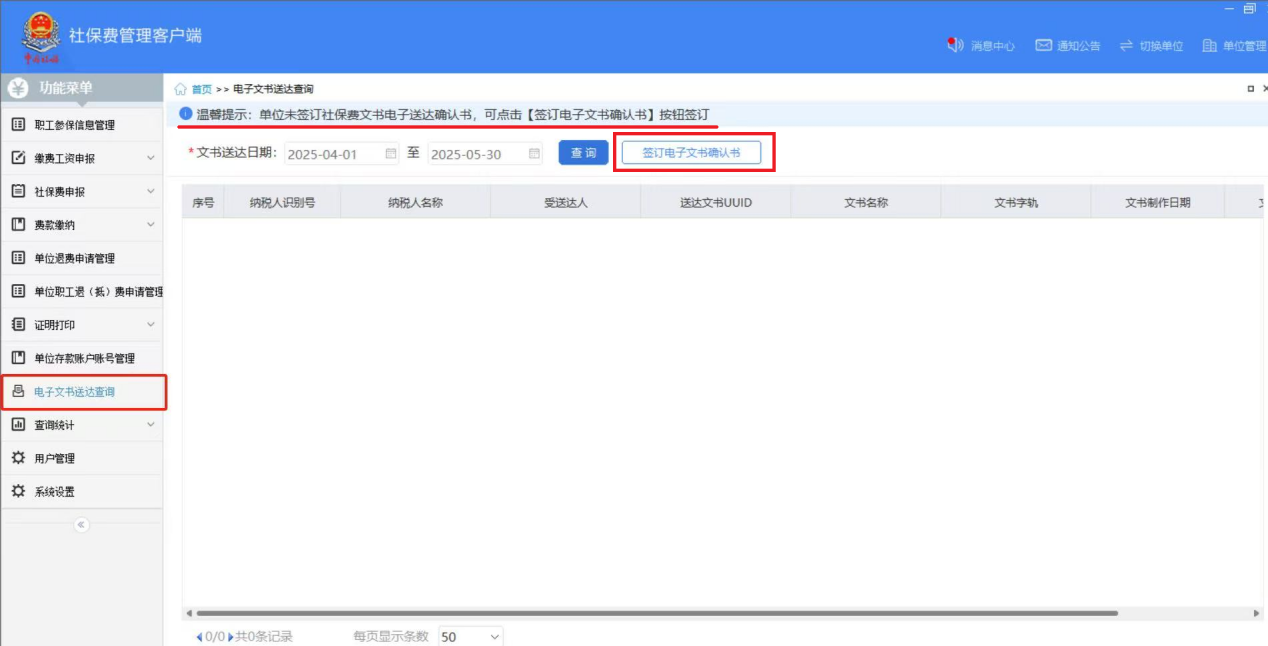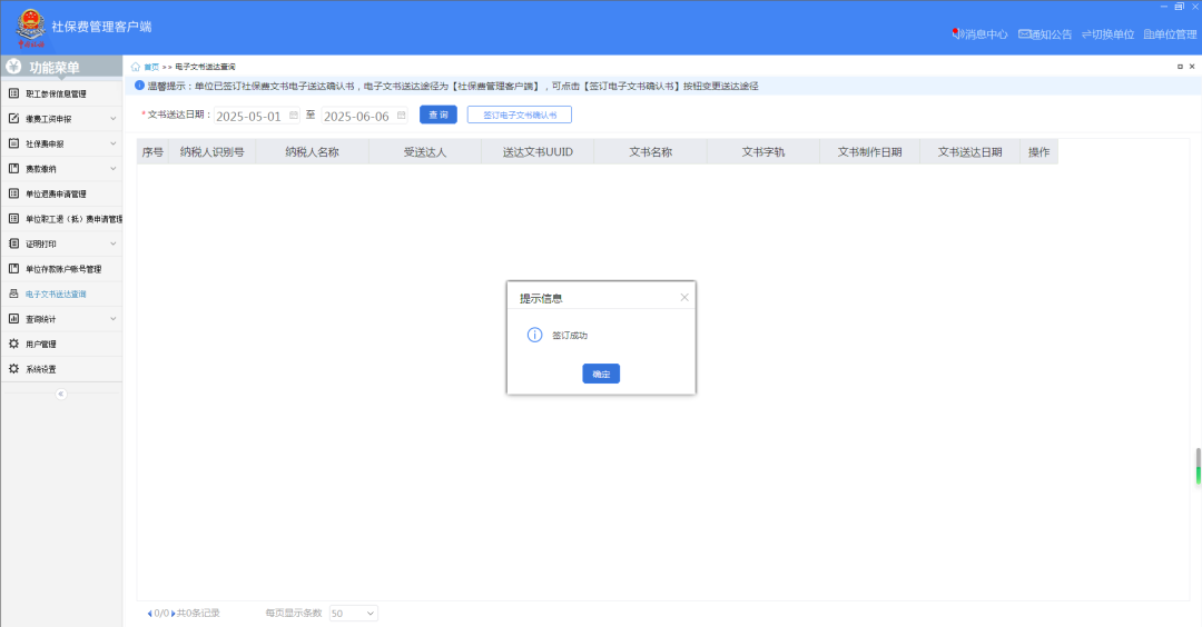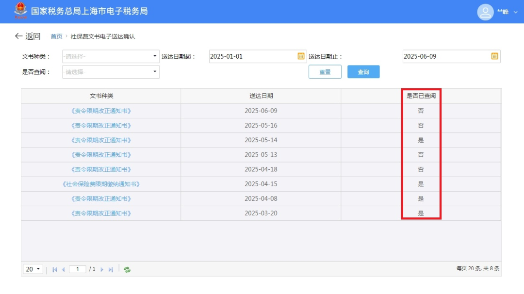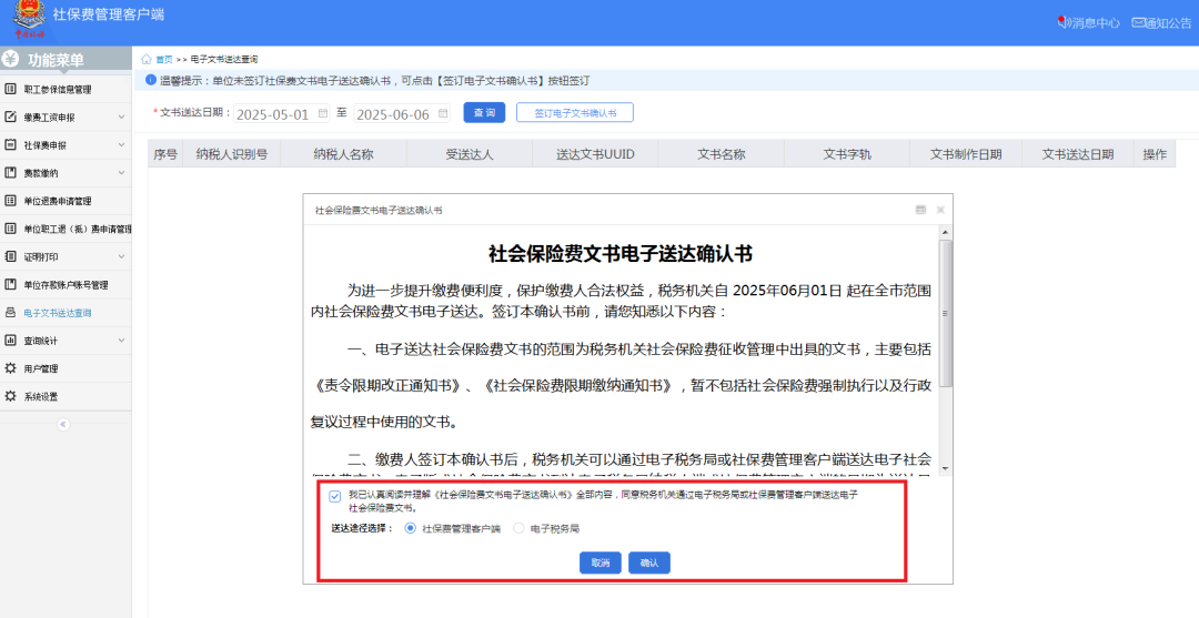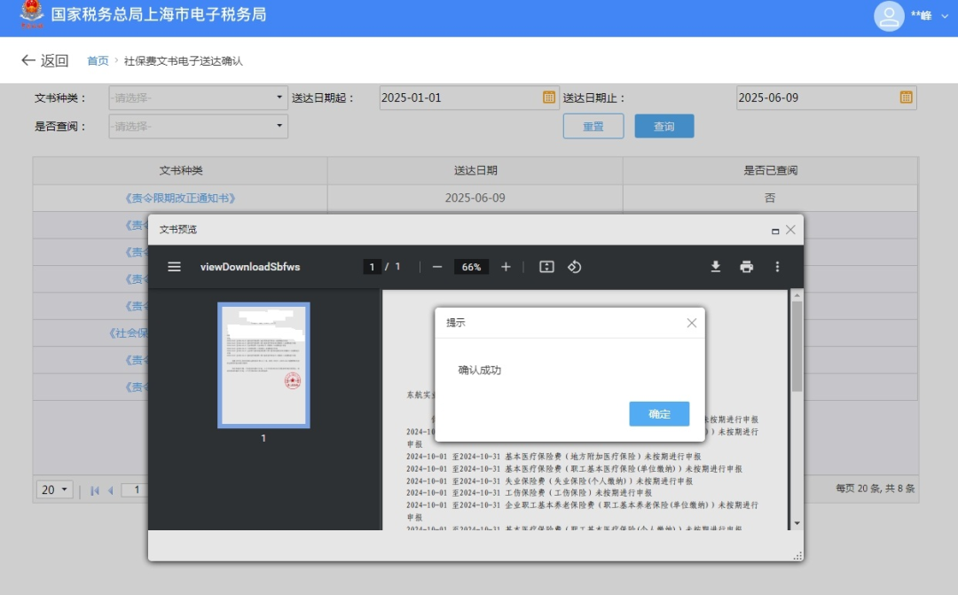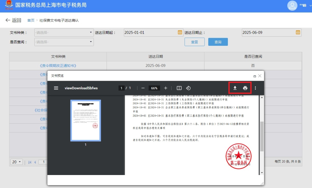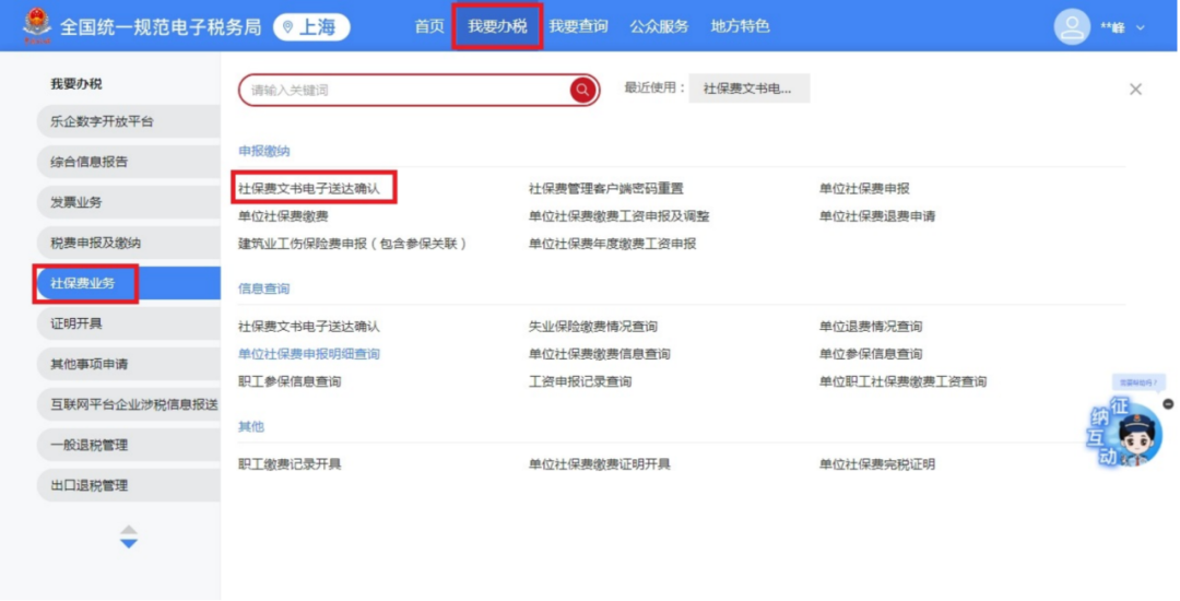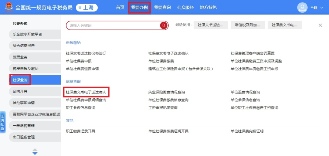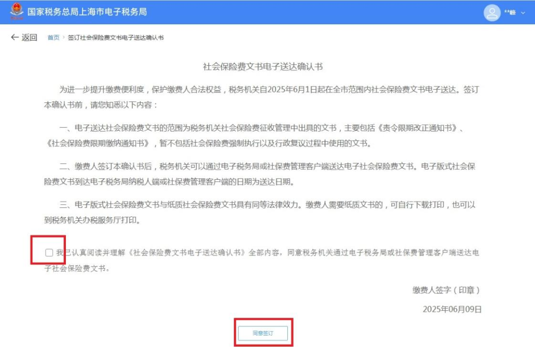 一、业务前提 税务机关将各环节制作好的需送达的各类税务文书,采用法定或约定的送达方式送达文书受送达人。 二、电子税务局签订税务文书送达专题 (一)如何在电子税务局上签订税务文书送达? 第一步:登录新电子税局后,在搜索框内输入“税务文书送达确认”关键字,点击即可。 第二步:进入税务文书电子送达确认书页面,勾选“我已认真阅读并同意”,点击“同意签订”。 (二)如何在电子税务局上查看税务文书信息? 登录新电子税局后,新接收且未查看过的税务文书,会显示在“我的待办——待签收文书”,点击“办理”即可。 对于已签收并办理过的税务文书,可以通过“我要查询——税务文书电子送达查询——税务文书送达确认”进行查询。 在“税务文书送达确认”模块,纳税人可以选择文书种类及送达起止日期,查询到具体送达的文书种类、送达日期以及查询情况;同时,显示纳税人电子送达确认书签订情况。 根据相关规定,电子送达税务文书的范围为税务机关税收征收管理中出具的各类文书,暂不包括税务处理决定书、税务行政处罚决定书(不含简易程序处罚)、税收保全措施决定书、税收强制执行决定书、阻止出境决定书以及税务稽查、税务行政复议过程中使用的税务文书。 三、社会保险费文书电子送达确认书专题 根据《国家税务总局上海市税务局通告2025年第2号》规定,为进一步提升缴费服务便利度,提高社会保险费征管效率,保护缴费人合法权益,自2025年6月1日起,在全市范围内实行社会保险费文书电子送达。 缴费人同意采用电子送达的,需签订《社会保险费文书电子送达确认书》。 缴费人可以通过电子税务局或社保费客户端直接签订电子版《社会保险费文书电子送达确认书》,也可以到税务机关办税服务厅签订纸质版《社会保险费文书电子送达确认书》,由税务机关及时录入系统。 (一)如何在电子税务局上签订社会保险费文书电子送达确认书? 登录电子税务局后,点击【我要办税】-【社保业务】-【申报缴费】-【社保文书送达协议书签订】,进入《社会保险费文书电子送达确认书》签订界面。 进入模块后,阅读《社会保险费文书电子送达确认书》内容并勾选提示信息,即可点击下方的“同意签订”按键完成确认书签订操作。 (二)如何在社保费管理客户端上签订社会保险费文书电子送达确认书? 登录社保费管理客户端后,进入功能菜单栏目中的【电子文书送达查询】模块。 若当前企业未签订《社会保险费文书电子送达确认书》,可点击界面上方“签订电子文书确认书”按钮,进入确认书签订界面。 阅读《社会保险费文书电子送达确认书》内容后,勾选提示信息并选择送达渠道后,即可点击“确认”,完成确认书签订操作。 (三)如何在电子税务局上查看社会保险费文书? 缴费人签订《社会保险费文书电子送达确认书》后,税务机关可以通过电子税务局送达电子版式社会保险费文书。 电子送达社会保险费文书的范围为税务机关社会保险费征收管理中出具的文书,主要包括《责令限期改正通知书》、《社会保险费限期缴纳通知书》,暂不包括社会保险费征收决定书、强制执行以及行政复议过程中使用的文书。 具体操作步骤如下: 1.登录电子税务局后,点击【我要办税】-【社保业务】-【信息查询】-【社保费文书电子送达确认】,进入社保费文书确认模块。 2.进入模块后,系统自动展示电子税务局接收到的社保费文书信息,通过上方的查询条件可进行精准查询。文书未查看时,“是否已查阅”栏次显示“否”;文书查看后,“是否已查阅”栏次显示“是”。 3.点击文书种类名称,即可查看文书明细。系统提示“确认成功”。 4.点击红框内功能图标,即可下载或打印对应文书。 注意事项: 1.税务机关通过电子税务局或社保费客户端送达电子版式社会保险费文书,电子版式社会保险费文书到达电子税务局或社保费客户端的日期为送达日期。 2.电子版式社会保险费文书与纸质社会保险费文书具有同等法律效力,缴费人可以据此办理涉费事宜,行使权利、履行义务。