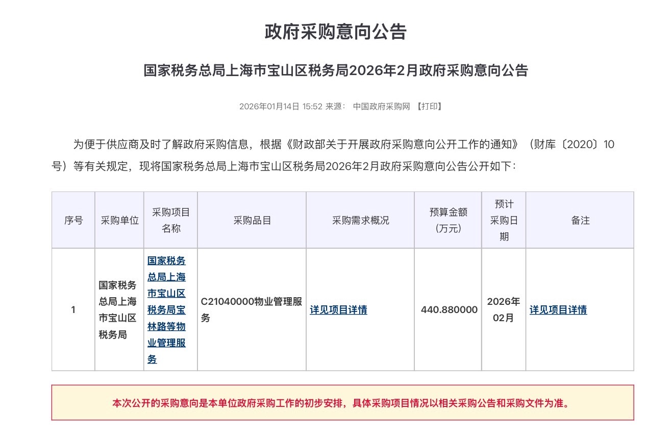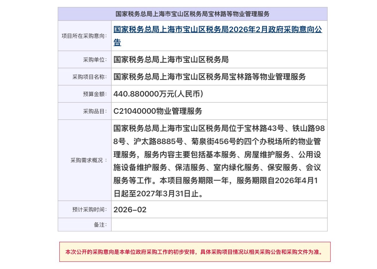 名称: 国家税务总局上海市宝山区税务局2026年2月政府采购意向