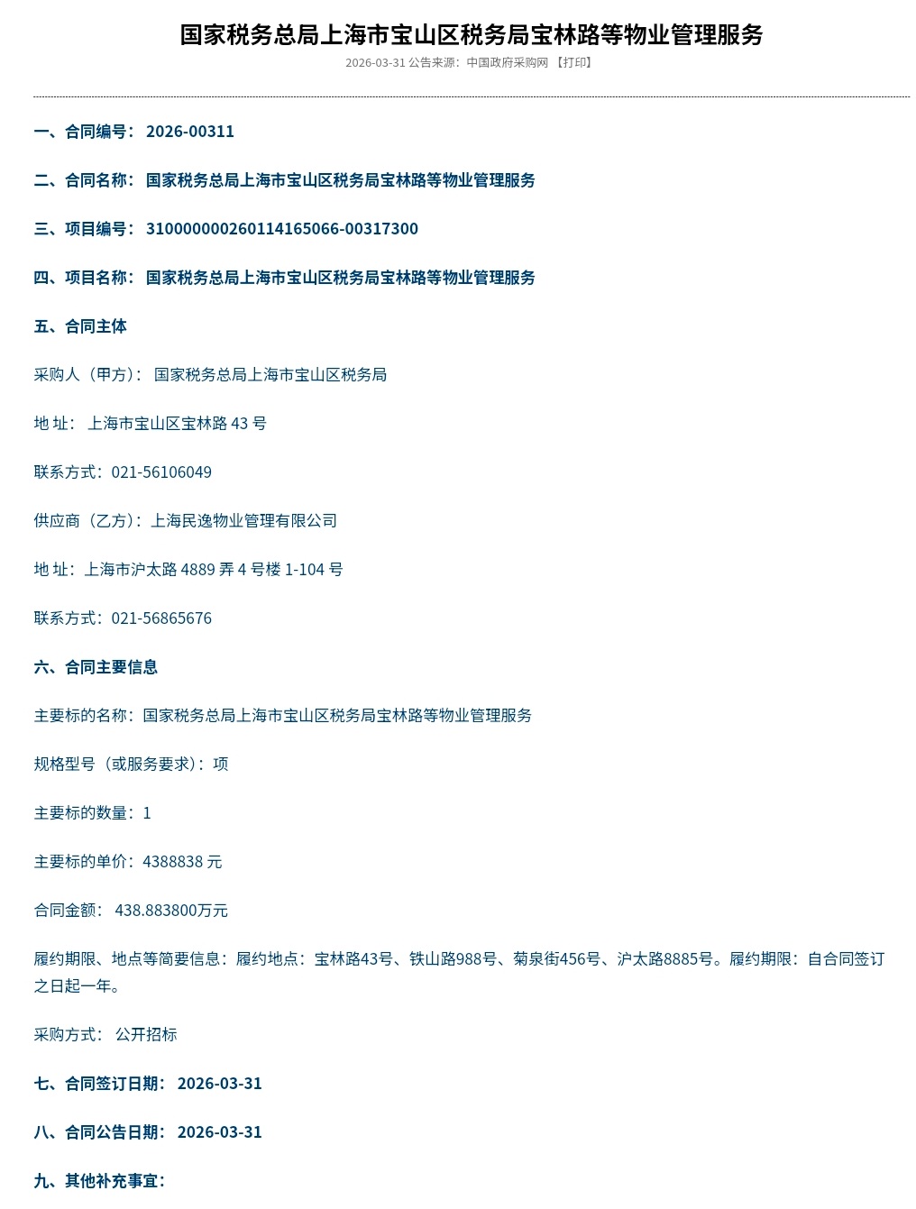 国家税务总局上海市宝山区税务局宝林路等物业管理服务合同公告