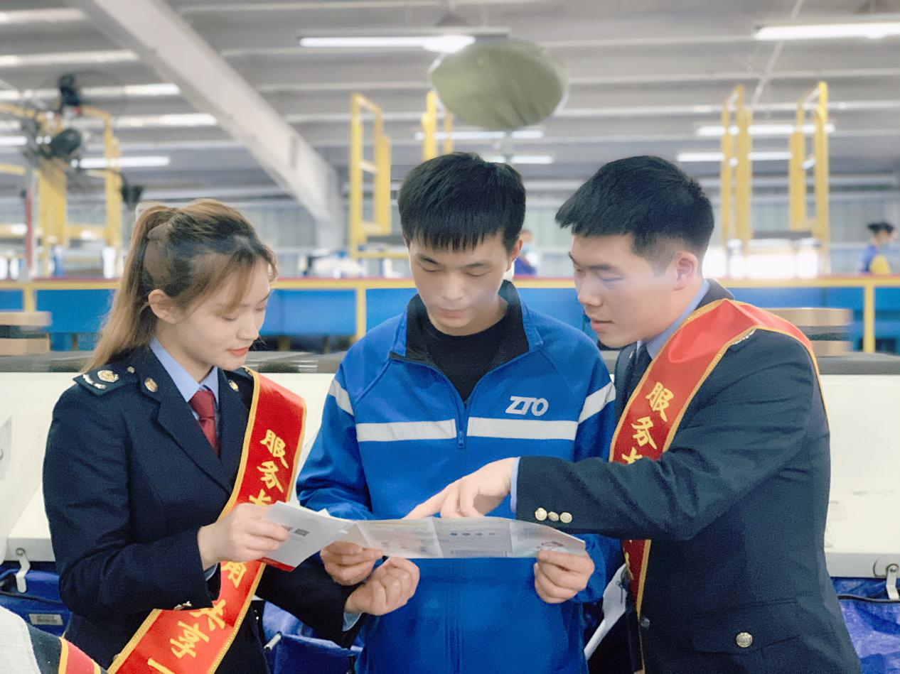 在中通快递分拣中心,税务干部向一线分拣的快递工作人员发放发放最新优惠政策手册,详细了解快递行业的近期发展,就快递人员普遍关心的个人所得税汇算问题进行细致解答。