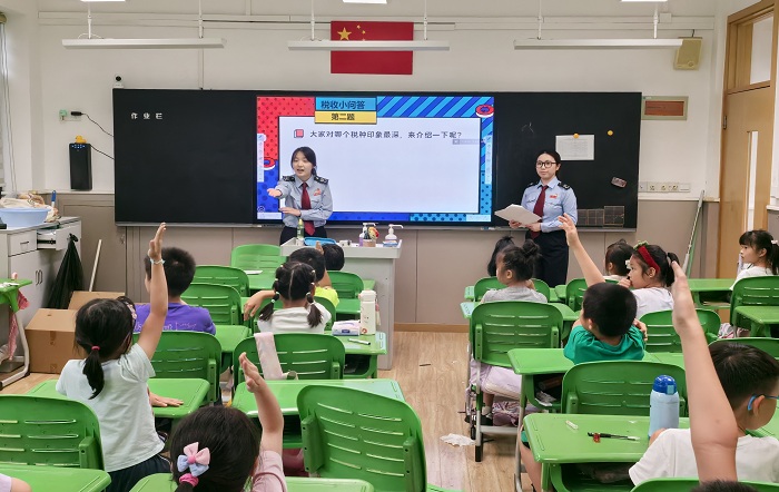区局精心设计教学内容,以“税收是什么?”为主题,用通俗易懂的语言讲解个人所得税、增值税等常见税种,并通过趣味问答和情景模拟,将晦涩的税法概念生活化,营造积极热烈的课堂氛围。课程着重阐释了税收“取之于民,用之于民”的核心理念,通过实际案例引导学生们理解税收支撑公共设施建设、城市发展等重要作用,在孩子们心中播撒下“依法纳税”“诚信纳税”的种子。