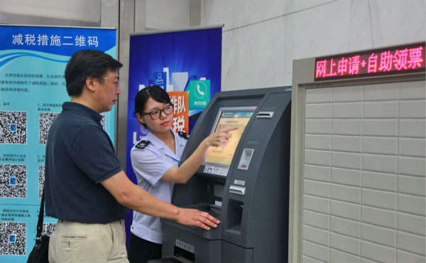 “在网上申请好之后,直接到自助办税机上领票,就像高铁取票一样方便。”日前,在虹口区税务局自助办税服务区,纳爱斯集团有限公司上海贸易分公司财务人员梅女士一边点击着触摸屏,一边对自助办税机新增的取票功能连连称赞。获得梅女士点赞的便民服务,就是虹口区税务局在全市第一家试点的发票“网上申请+自助领票”服务。据介绍,企业凭CA证书进入上海市税务局网上办税服务厅“发票办理”模块,详细录入发票申领预约信息。预约成功后,企业领票人携带本人身份证即可到自助办税机上随时领取发票,不再受工作时间影响。