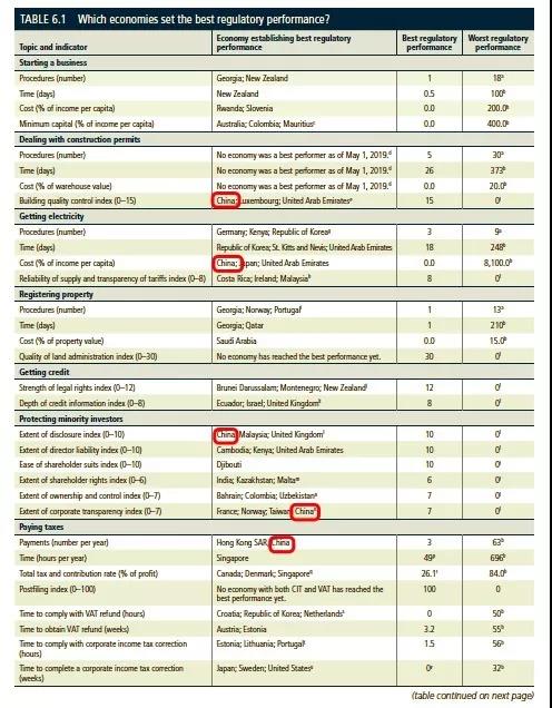除了以上几个突出的改革亮点,世界银行认为,中国在以下方面的改革也值得肯定:将公司印章发放完全纳入企业注册登记一站式服务;简化对低风险工程建设项目的施工许可证要求,缩短供排水接入时间;精简办理接电流程,提高电费透明度;通过要求控股股东对不公平关联方交易承担连带责任,明晰所有权和控制结构,加强了对少数投资者的保护;对小企业实行企业所得税优惠政策,降低某些行业的增值税税率,加强电子化纳税申报和缴纳系统;通过实行进出口货物提前申报、升级港口基础设施、优化海关行政管理和公布收费标准等措施,简化进出口程序;通过规定可给予的合同延期次数上限和将延期限于不可预见和例外情况,提升执行合同的便利度;通过规定破产程序启动后的债权优先规则和提升债权人在破产程序中的参与程度,提高办理破产的便利度。