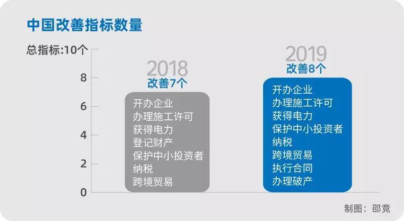 在世界银行此次报告的测评时间内(去年5月1日-今年5月1日),中国创纪录地对10项营商环境指标中的8项进行了改革,是参与测评的190个经济体中改善项目第二多的经济体之一,在满分100分中得到77.9分。