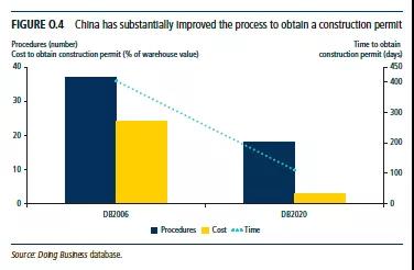 在办理施工许可领域,与2005年相比,今年中国在流程数量和时间方面都显著减少,因此在《2020年营商环境报告》中的得分和排名都得到显著提高。来源:《2020年营商环境报告》。