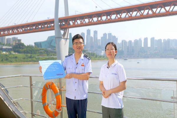 在洪崖洞客运码头,重庆税务人员走访重庆市客轮有限公司,直播讲解车船税相关政策。
