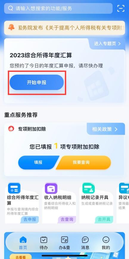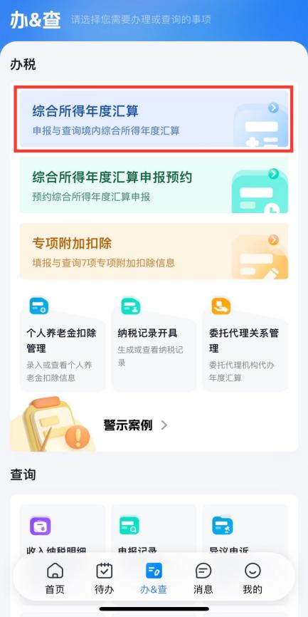 答:打开个人所得税APP,您可通过【首页】——【2023年综合所得年度汇算】专题区域,点击【开始申报】;或通过【办&查】——【办税】——【综合所得年度汇算】功能,开始申报。
