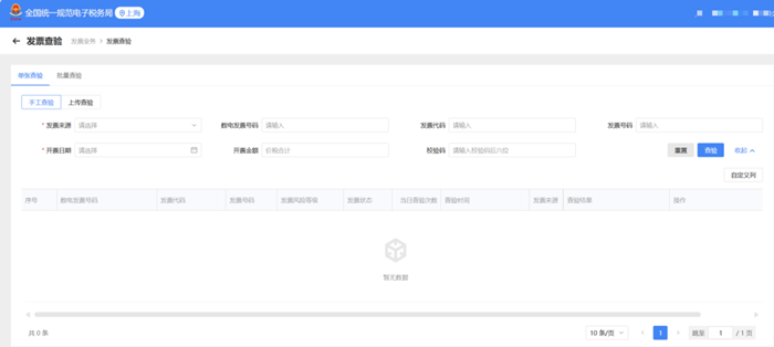 您可以点击【税务数字账户】-【发票业务】-【发票查验】,进入发票查验模块。