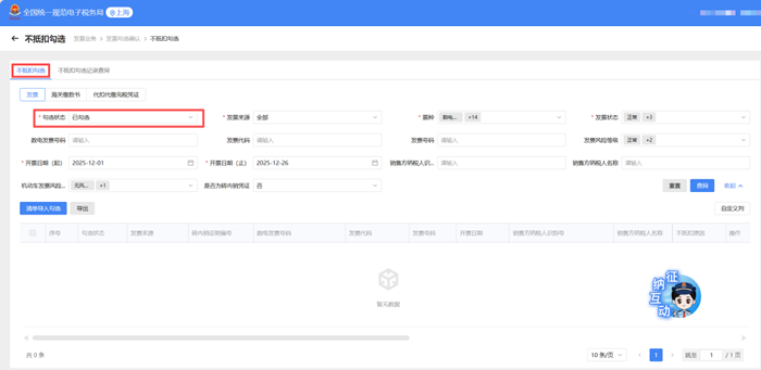 通过税务数字账户-发票勾选确认-不抵扣勾选模块,设置查询条件,点击查询,便可得到符合筛选条件的发票信息的查询结果,如确认发票已认证为“不抵扣勾选”的,可进行撤销勾选操作。