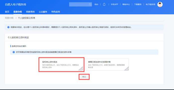 第二步:选择股权转让资料报送选项,点击确定进入填报界面。