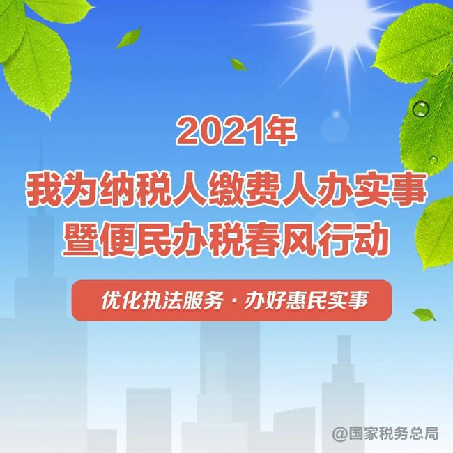 2月24日,国家税务总局举行新闻发布会,启动2021年“我为纳税人缴费人办实事暨便民办税春风行动”,推出10大类30项100条具体措施,为纳税人缴费人解难题。看看今年的春风行动有哪些亮点↓