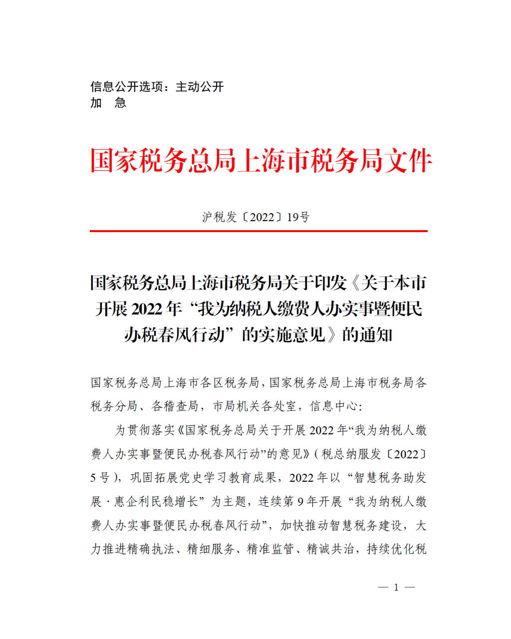 为贯彻落实《国家税务总局关于开展2022年“我为纳税人缴费人办实事暨便民办税春风行动”的意见》(税总纳服发〔2022〕5号),巩固拓展党史学习教育成果,2022年以“智慧税务助发展·惠企利民稳增长”为主题,连续第9年开展“我为纳税人缴费人办实事暨便民办税春风行动”,加快推动智慧税务建设,大力推进精确执法、精细服务、精准监管、精诚共治,持续优化税收营商环境,现将市局制定的《关于本市开展2022年“我为纳税人缴费人办实事暨便民办税春风行动”的实施意见》印发给你们,请各单位、各部门结合工作实际按照执行。