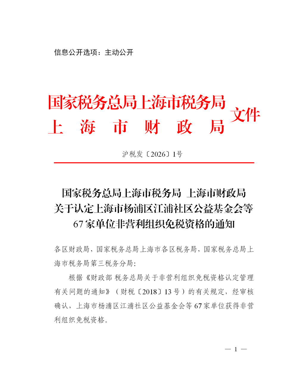 根据《财政部 税务总局关于非营利组织免税资格认定管理有关问题的通知》(财税〔2018〕13号)的有关规定,经审核确认,上海市杨浦区江浦社区公益基金会等67家单位获得非营利组织免税资格。