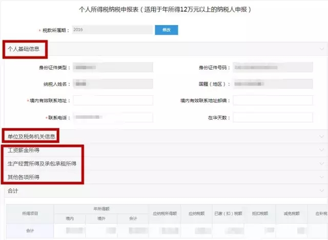 页面下方合计栏中数字为系统根据“工资薪金所得”、“生产经营所得及承包承租所得”、“其他各项所得”三项数字自动累加,无须自行填写。
