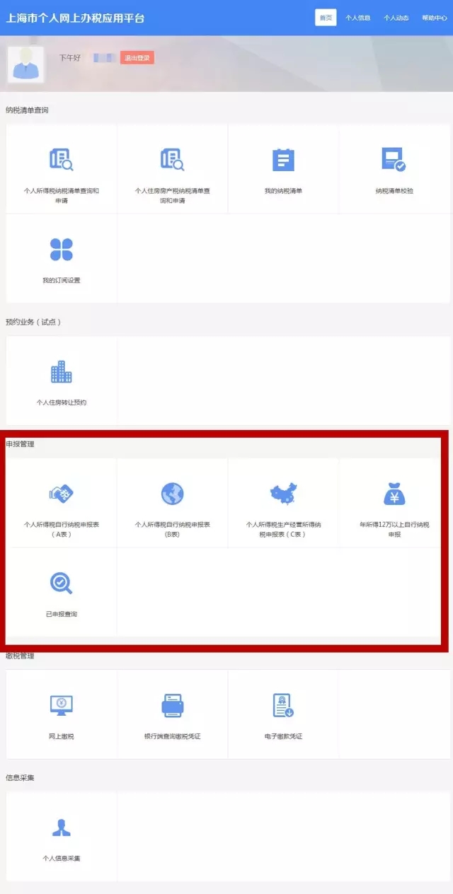 3.浏览页面内从上至下5大块内容中的第3块内容“申报管理”点击“申报管理中”第四项【年所得12万以上自行纳税申报】,进入12万申报主页面。