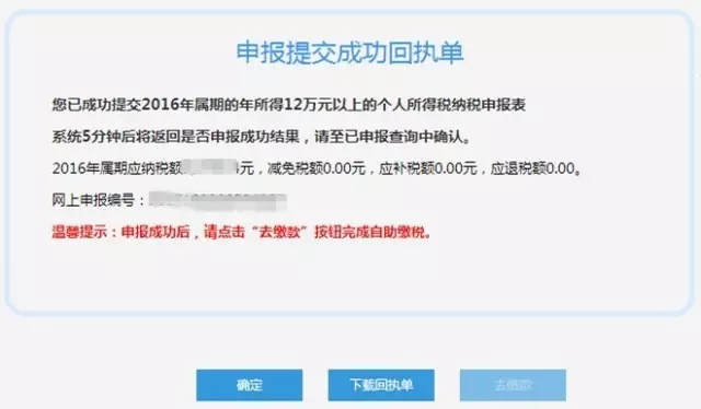 2.如申报成功后发生应补税额,可直接通过申报提交成功页面下方的“去缴税”按钮实现缴税。或者点击“个人网厅首页”—“缴税管理”—【网上缴税】选择未缴记录进行缴税。