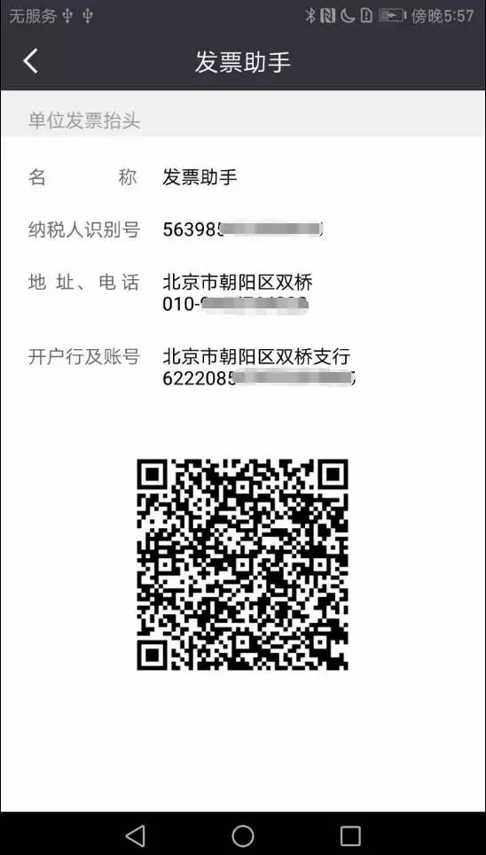 安装发票助手1.0(Android版),点击右侧“生成企业二维码”填写名称、纳税人识别号、地址电话(非必填项)和开户行及账号(非必填项)信息后,点击确认按钮,即可生成二维码。注意开具增值税专用发票需要填写四项信息。