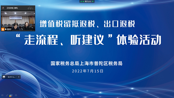 为深入贯彻落实党中央、国务院关于实施新的组合式税费支持政策的决策部署,近日,普陀区税务局开展增值税留抵退税、出口退税“走流程 听建议”线上体验活动。活动邀请了上海市人大代表、政协委员,区财政、市场局、工商联代表以及区局税费服务体验师、特约监督员共16人参会,通过“亲自办”、“陪同办”、“体验办”,谈体会、问实效、提建议,促进税费服务质效提升、优惠政策执行落地。