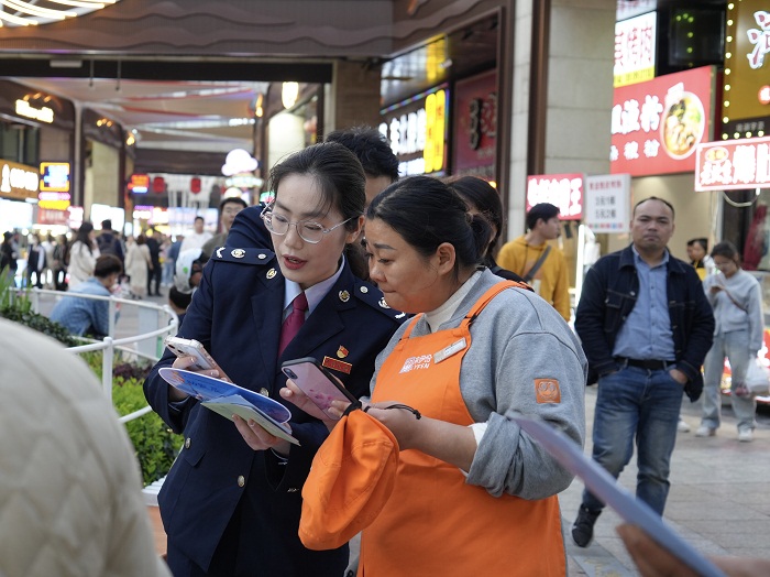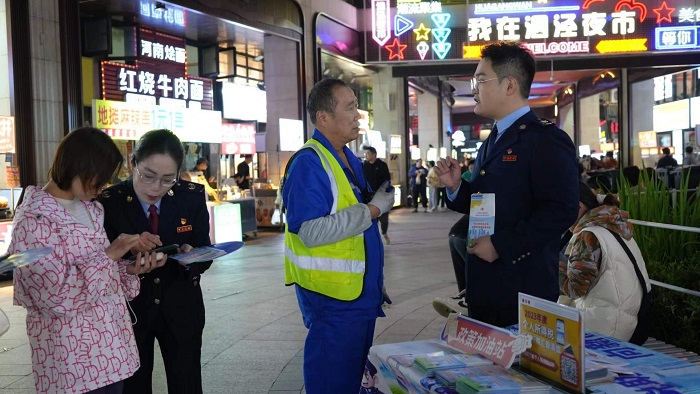 近日,松江区税务局税宣小队走进上海最大的露天夜市——泗泾夜市,充分利用夜市人流量大的有利条件,搭起“政策加油站”税收宣传小摊,采取“设咨询点+流动走访”的形式开展税收宣传,为点亮城市夜经济注入蓝色“税动力”,助燃春日城市烟火气。