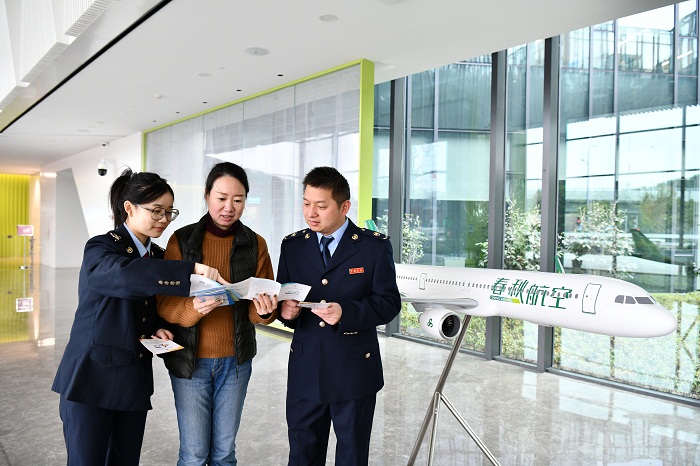 春秋航空的发展历经风雨,税务部门陪伴其每个经营周期。长宁区税务局在2020年成立航空服务业工作组,形成了学习、调研、实践相结合的机制,一方面,精准施策,帮助所有航空服务业企业享受税费优惠政策,通过增值税留抵退税等优惠政策减轻企业资金难题;另一方面,深入企业调研,以“服务包”的形式组团调研,上门了解涉税诉求,帮助企业享受税惠政策,解决各类个性化“疑难杂症”。此外,区局特色“蒲公英”楼宇服务站近期已入驻春秋航空大厦,为“零距离”收集企业问题,第一时间反馈回应提供保障。