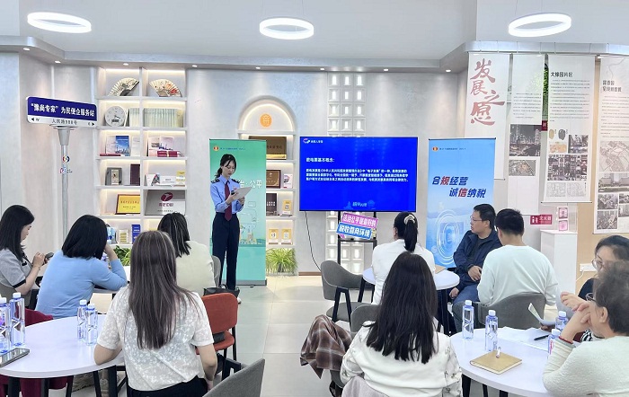 政策宣讲“零距离”,税政要点贴心讲。在豫园街道普法驿站,税收宣讲员以“数电票赋额疑难讲解”为专题,重点解读数电票额度调整规则、审批流程、风险防控等内容,结合辖区老字号企业、科创型中小微企业用票需求,通过实操指导和现场答疑,确保纳税人“懂流程、会操作、能开票”。