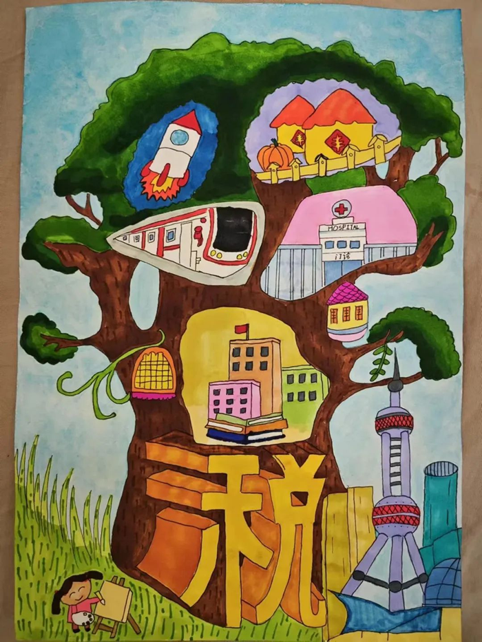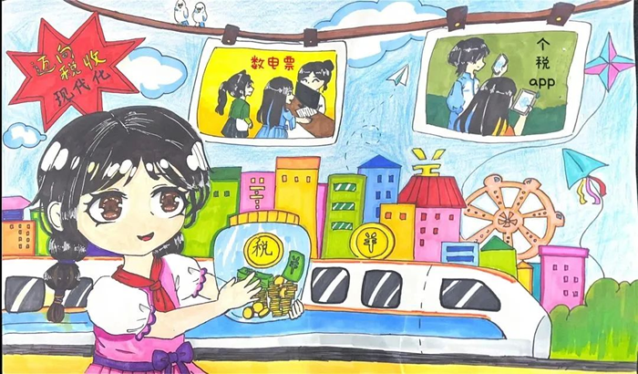 该作品以税收“取之于民 用之于民”为基点,通过“数电票”试点、“个税”APP退税等方便纳税人的举措以点带面反映我国正在税收现代化的路上行稳致远,同时契合第32个全国税收宣传月“税惠千万家 共建现代化”的主题。(陶羽歆 5岁)。