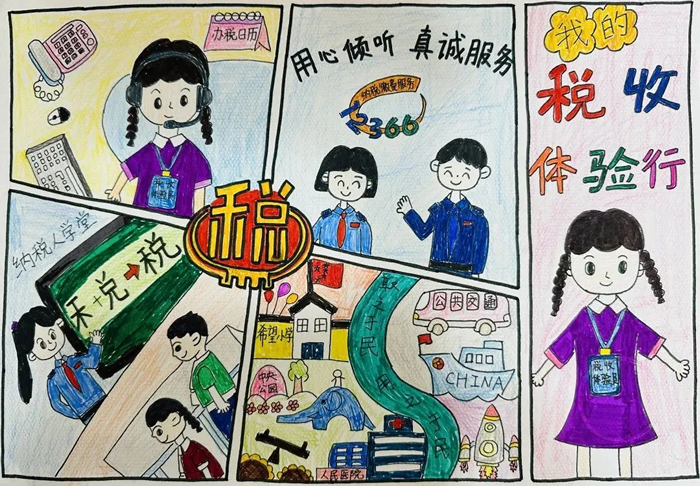 该作品以孩子的视角,用充满童趣的绘画描述了自己参与“小小税务体验师”活动的过程,通过零距离参观体验12366的所见、所闻、所想,开启了孩子探寻税收世界、学习税法知识的奇妙之旅。(郑宇桐 10岁)