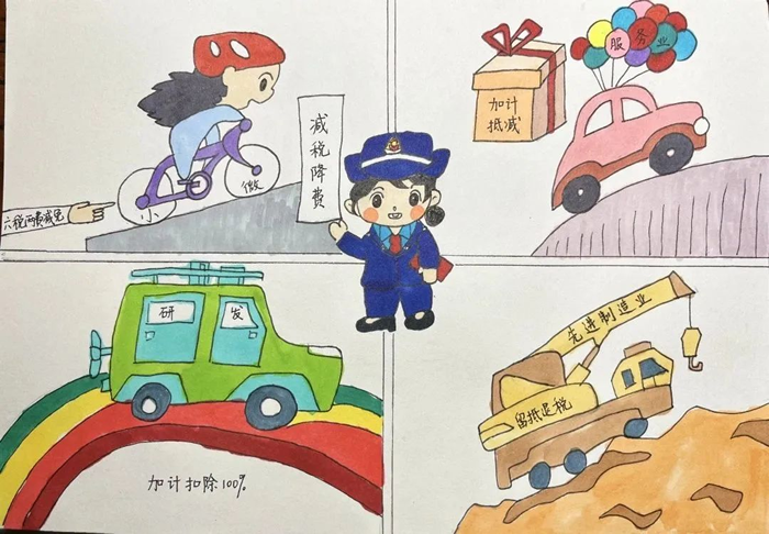 该作品通过税收漫画的形式展现出税务机关通过“六税两费”减免、加计抵减等一系列的减税降费政策为企业减负,激活企业创新动力和活力,助力企业进一步转型升级。(马又嘉 12岁)