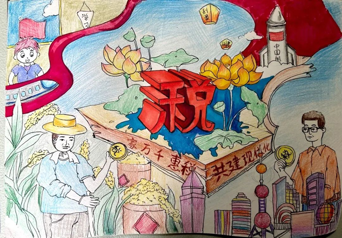 该作品展现了助力乡村振兴、赋能大国重器等国之发展与税收息息相关的场景,并取”莲“清廉之意,寓意税务人以廉洁的政治本色为税收助力中国式现代化保驾护航。(张芷茗 12岁)