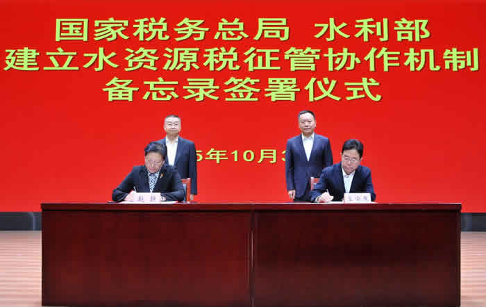 10月30日,国家税务总局、水利部在京签署《建立水资源税征管协作机制备忘录》,进一步深化两部门协作,巩固和扩大水资源税改革成果,促进水资源高效节约利用,服务保障美丽中国建设。国家税务总局党委书记、局长胡静林,水利部党组书记、部长李国英出席签署仪式。