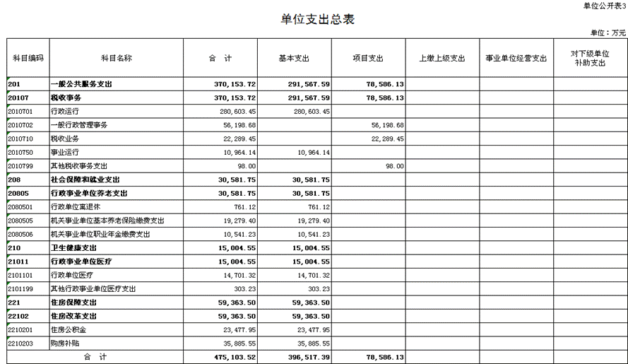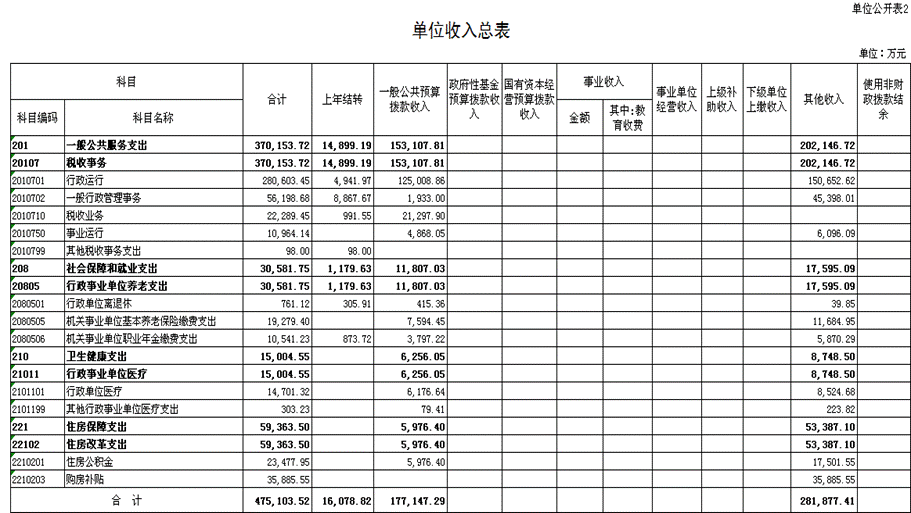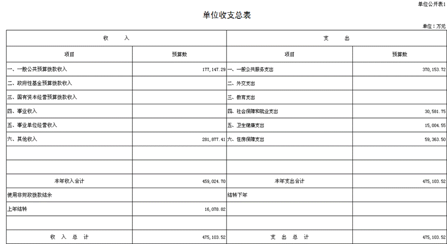 2021年单位收支总预算475,103.52万元。按照综合预算的原则,所有收入和支出均纳入单位预算管理。收入包括:一般公共预算拨款收入、其他收入、上年结转;支出包括:一般公共服务支出、社会保障和就业支出、卫生健康支出、住房保障支出。