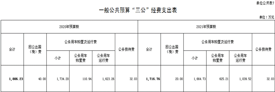 2021 年“三公”经费预算数为 1,716.76万元,其中:因公出国(境)费 20.00 万元,公务用车购置及运行费 1,664.73 万元,包括公务用车购置费625.21 万元、公务用车运行费1,039.52万元,公务接待费 32.03 万元。2021 年“三公”经费预算比 2020年减少 89.47 万元,压缩 4.95%。主要是按照党中央、国务院关于过紧日子和坚持厉行节约的有关精神,厉行节约办一切事业,压减“三公”经费支出。其中: