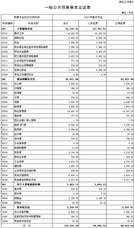 2021 年使用中央财政拨款安排一般公共预算基本支出 153,916.39 万元,其中: