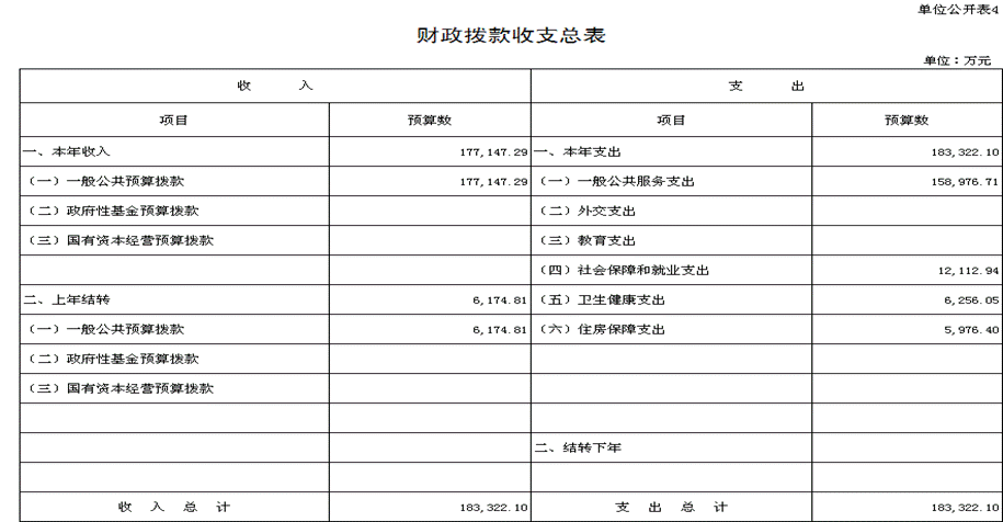 2021 年财政拨款收支总预算 183,322.10万元。收入全部为一般公共预算拨款,无政府性基金预算拨款和国有资本经营预算拨款,包括:一般公共预算当年拨款收入 177,147.29万元,上年结转 6,174.81 万元;支出包括:一般公共服务支出 158,976.71万元、社会保障和就业支出 12,112.94 万元、卫生健康支出 6,256.05 万元、住房保障支出 5,976.40 万元。