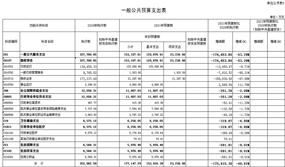 2021 年一般公共预算支出177,147.29 万元,比2020 年执行数减少175,815.30万元,降低49.81%。按照党中央、国务院关于过紧日子的有关要求,厉行节约办一切事业,大力压减一般性支出,重点压减了公用经费和一般行政管理、税收业务等项目支出中涉及的非急需非刚性支出,体现在有关支出科目中。具体安排情况如下: